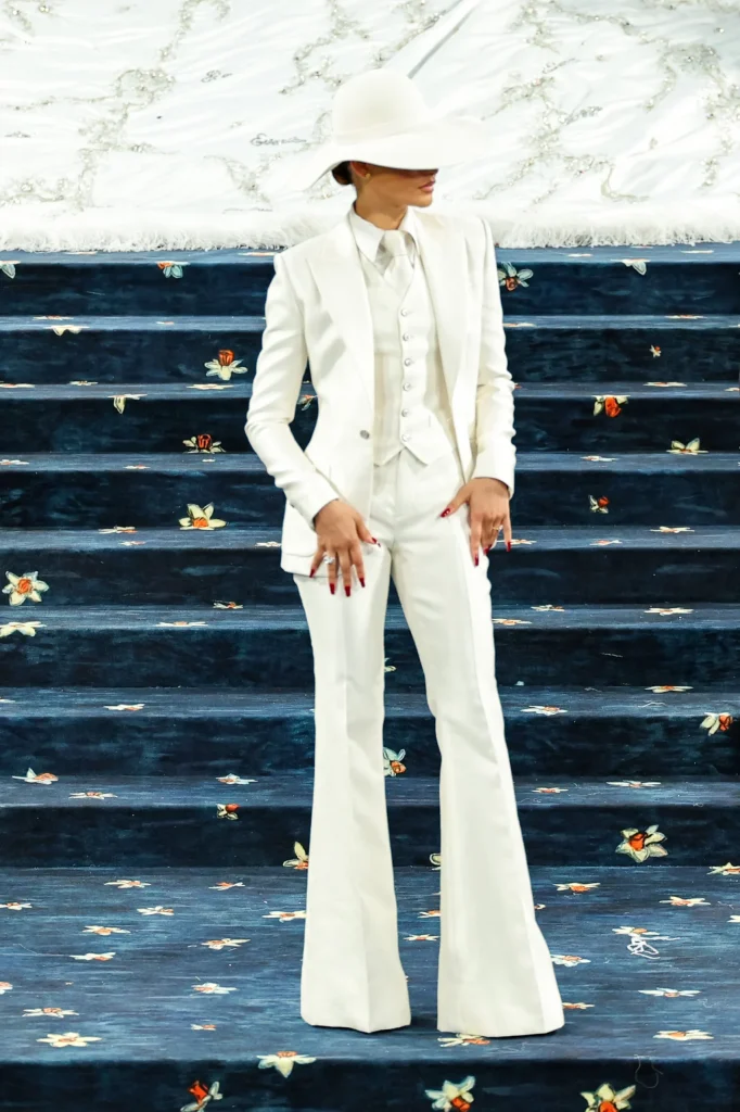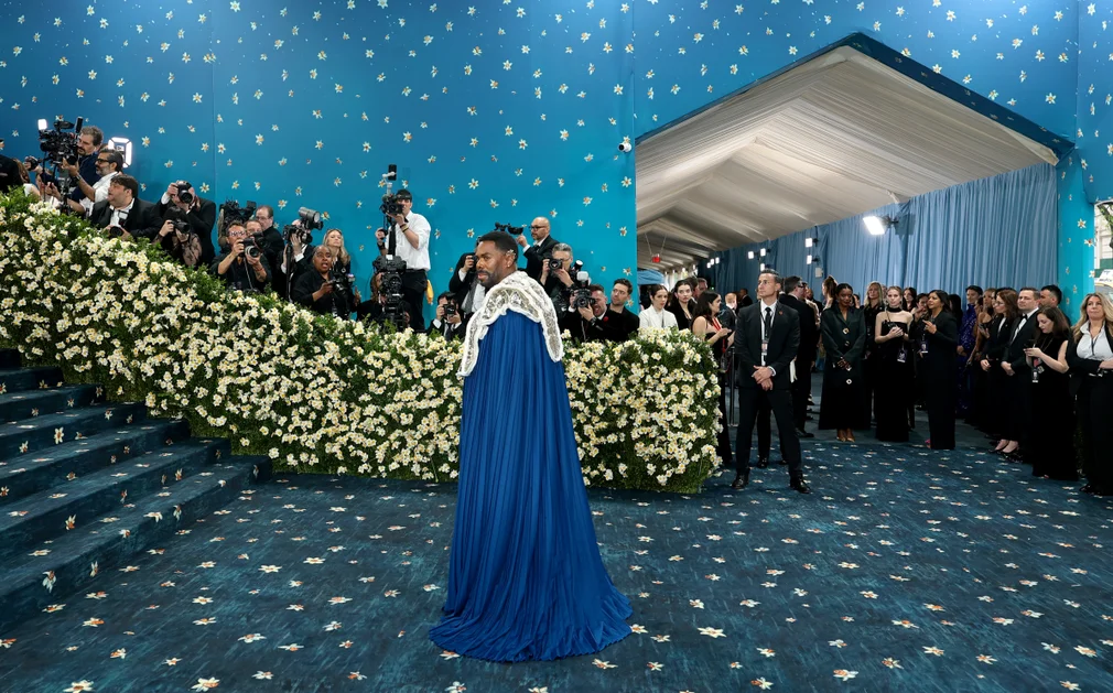A consistent Met Gala standout, Zendaya once again pushed boundaries in a tailored midnight-blue gown that transformed into a sharply cut pantsuit beneath. The look, created by Law Roach and a team of Black designers, symbolized strength and transformation, incorporating heritage fabrics and nods to diasporic design traditions.