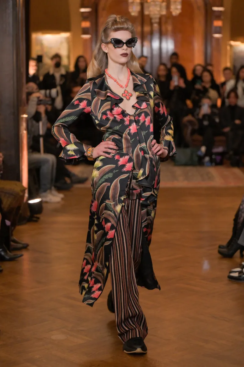One of the collection’s highlights was Sui’s collaboration with John Fluevog, unveiling triple-hued sneakers that added a modern, unexpected contrast to her period-inspired ensembles. The designer also partnered with Mondottica for oversized Peggy Guggenheim-style cat-eye sunglasses, a tribute to the avant-garde art patron.