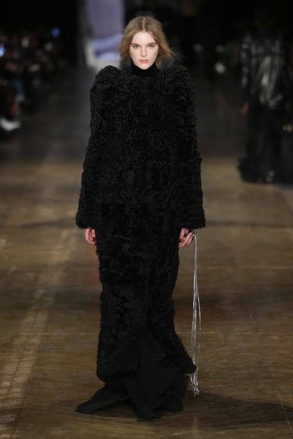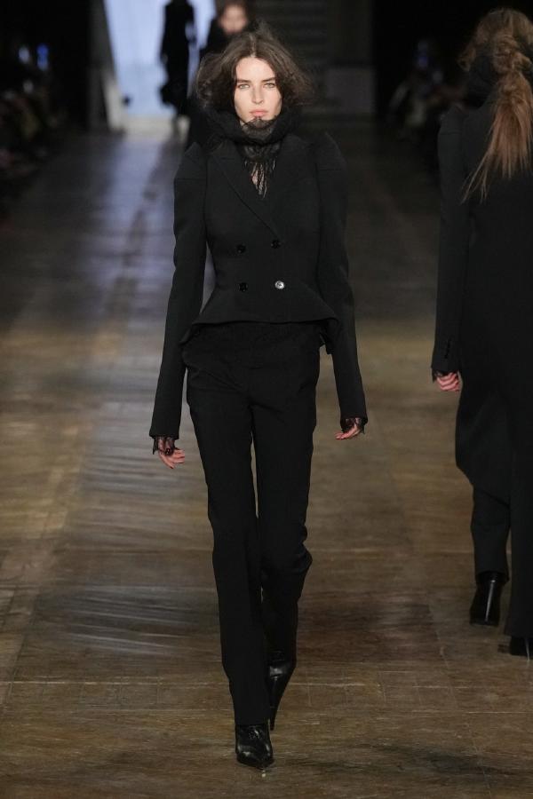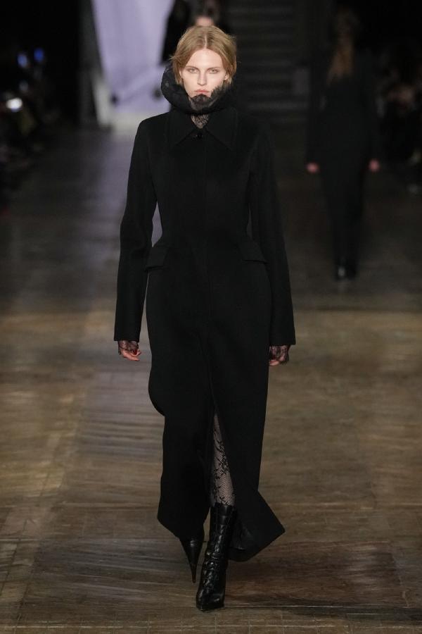 Accessories were equally striking, with statement belts, metallic harnesses, and knee-high leather boots reinforcing the collection’s rebellious spirit. Elaborate headpieces and sculptural jewelry added an avant-garde touch, staying true to the house’s theatrical roots. Hair and makeup featured sleek, wet-look styles, bold eye accents, and a gothic-inspired allure that complemented the collection’s intensity.