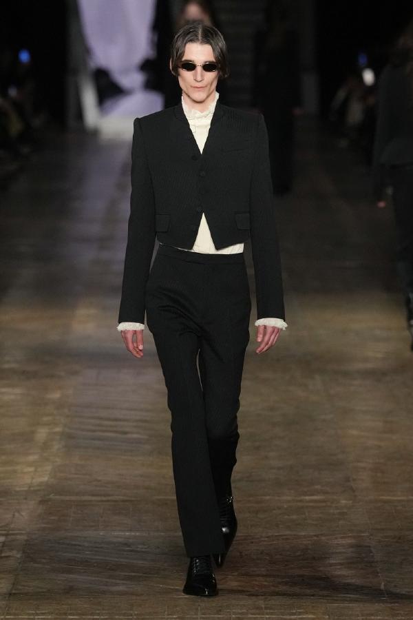 Textures played a key role in enhancing the collection’s depth. Sumptuous velvet, distressed leather, and shimmering metallic fabrics were juxtaposed with delicate lace, sheer tulle, and intricately beaded details. The result was a collection that felt both ethereal and armor-like—an homage to the brand’s heritage of warrior-like elegance.