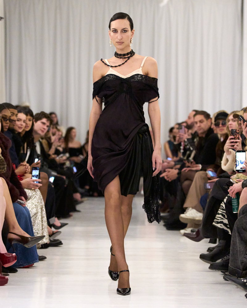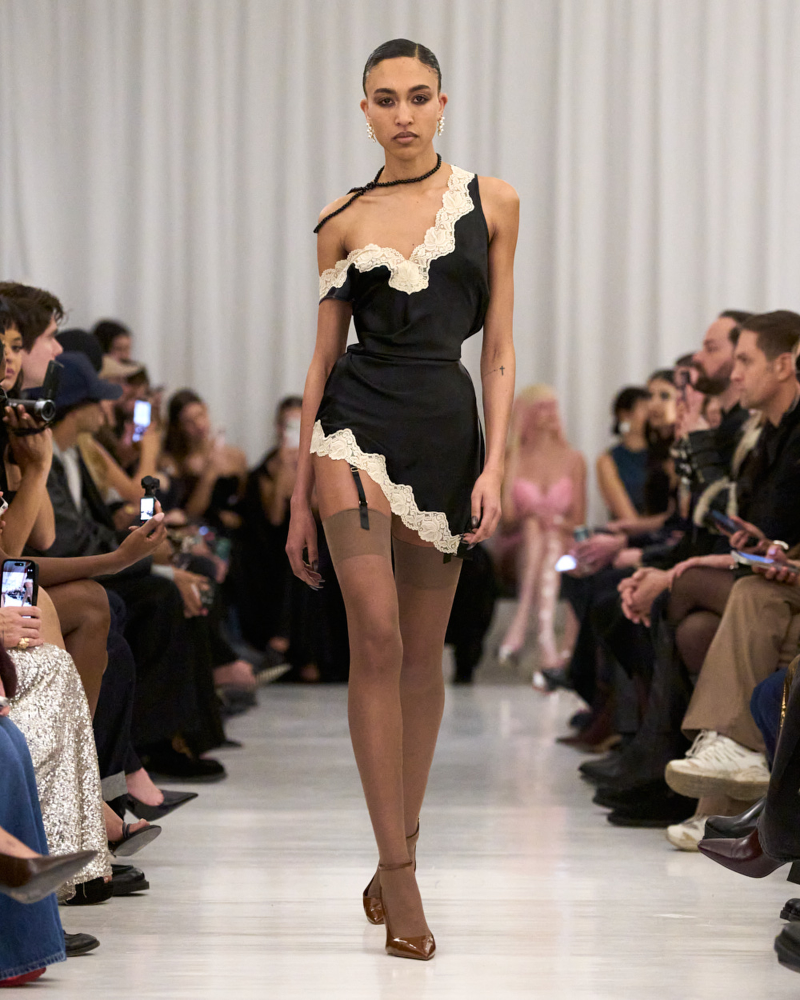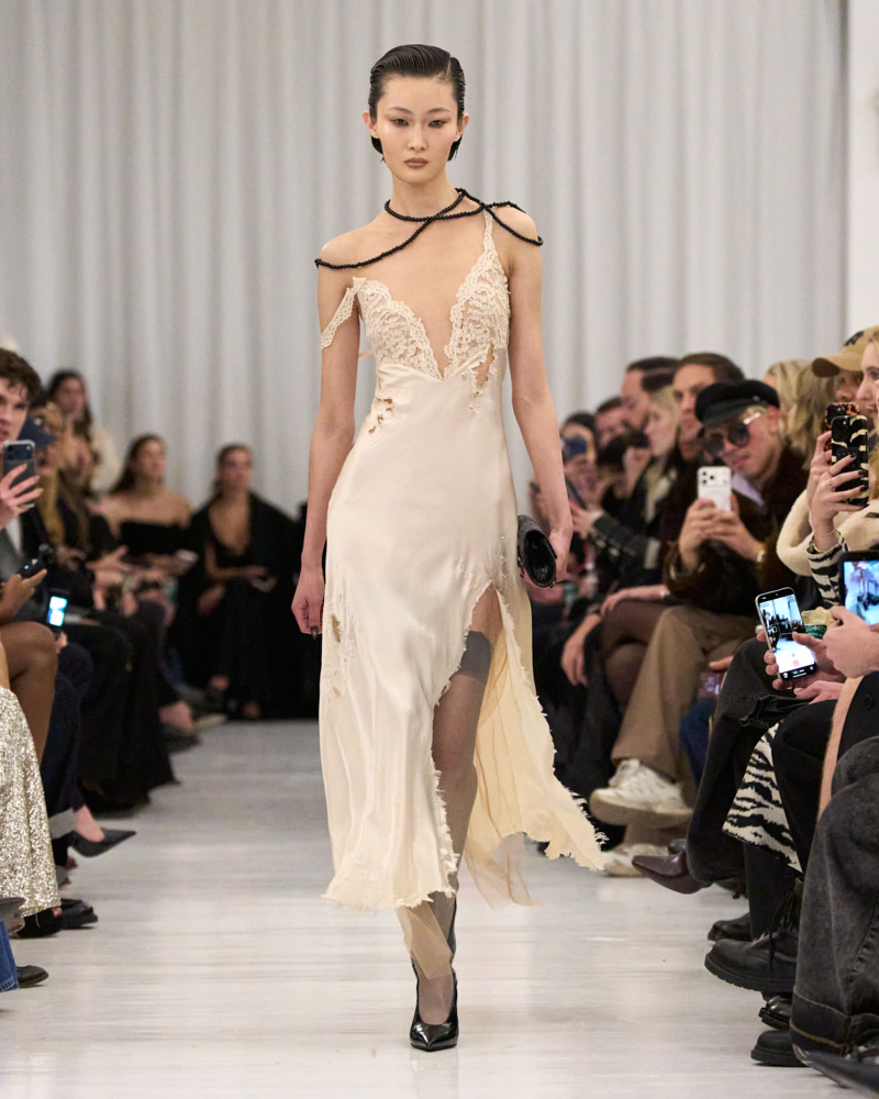 He certainly captured the rush of excitement that comes during the process of self creation through lace negligees with straps sliding off shoulders and hems bunched up on the hip, revealing garters underneath. Ripped and tattered in places, they had a time-worn quality as if left abandoned on a movie studio lot, only to be rediscovered decades later. Instead of working with new fabrics, Cowan sourced vintage garments spanning Hollywood’s golden era from the ’20s to the ‘50s and upcycled them. “I’ve never worked that way before,” he said. “But it was cool. I found it really, really fun.”