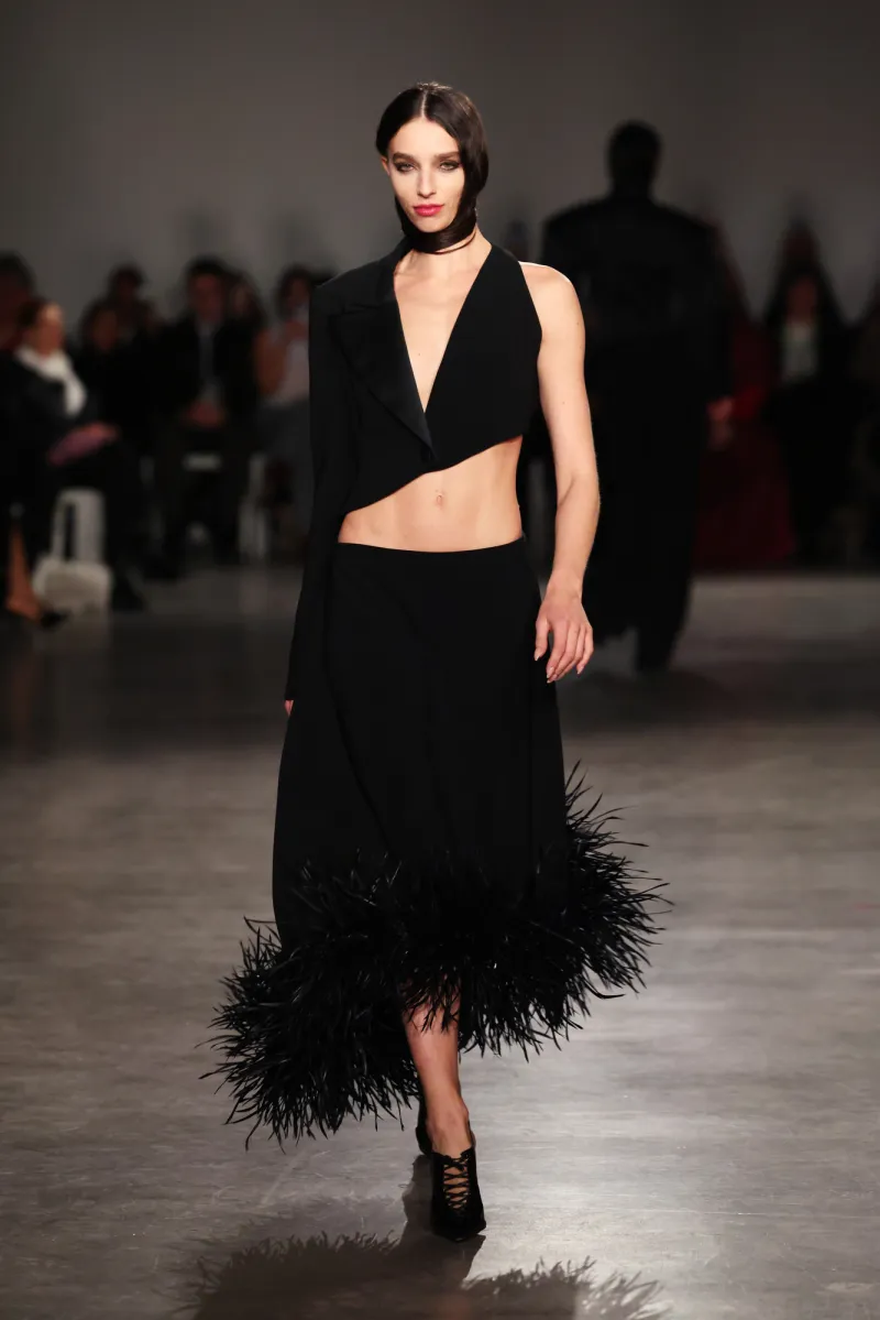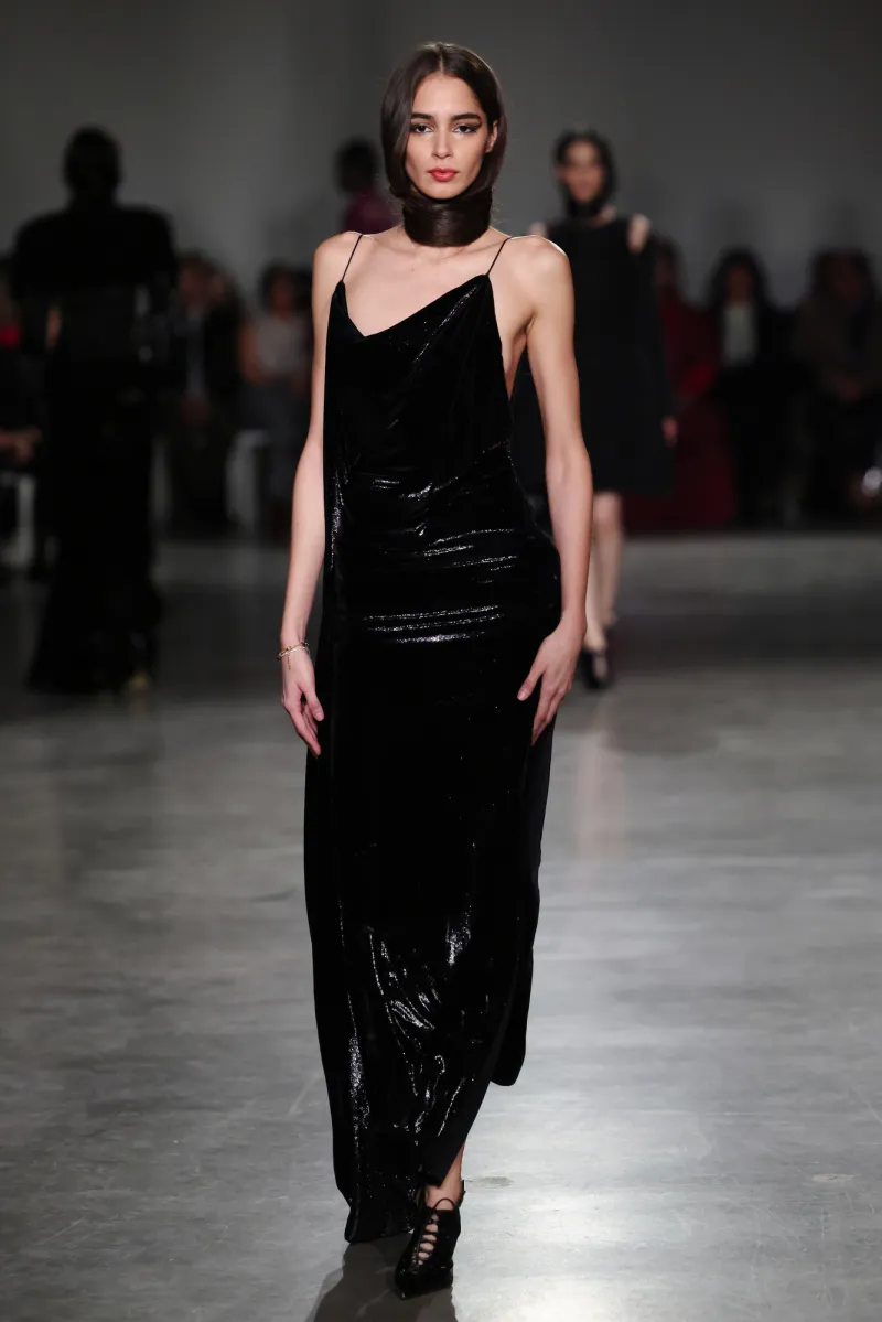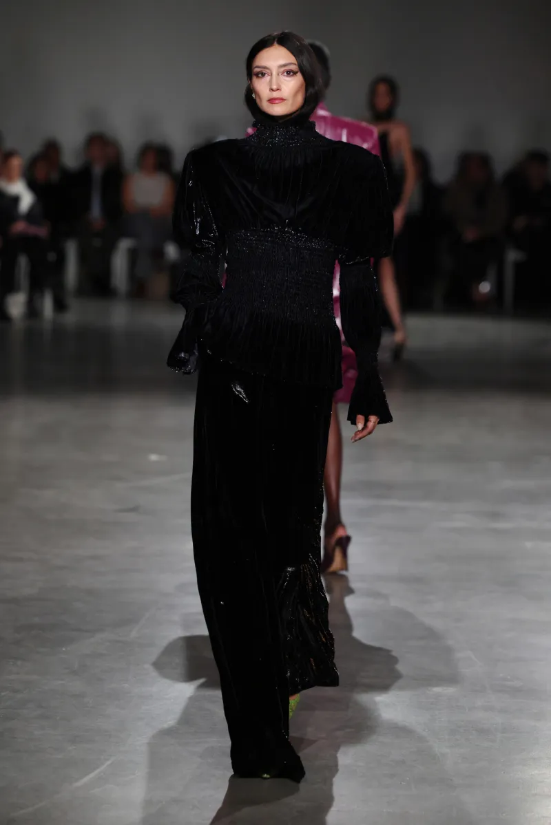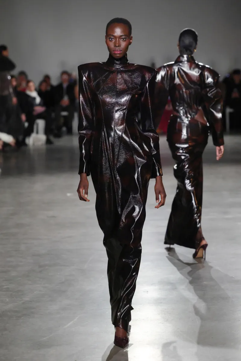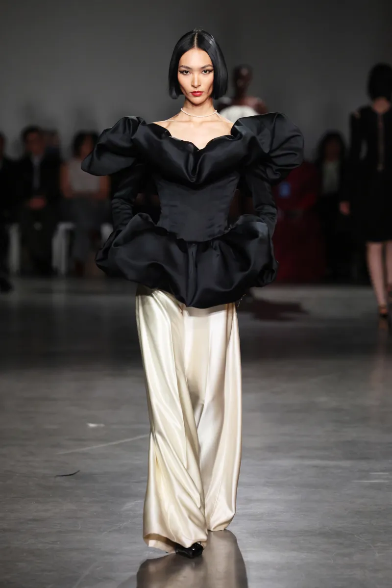 The palette hooks you slow: shadowy charcoals and inky obsidian suck you into mystery, then erupt into fiery crimson and liquid gold—like bursting from a stormy night into a golden sunrise party. The runway unfolded like a movie, each outfit ramping up the thrill.