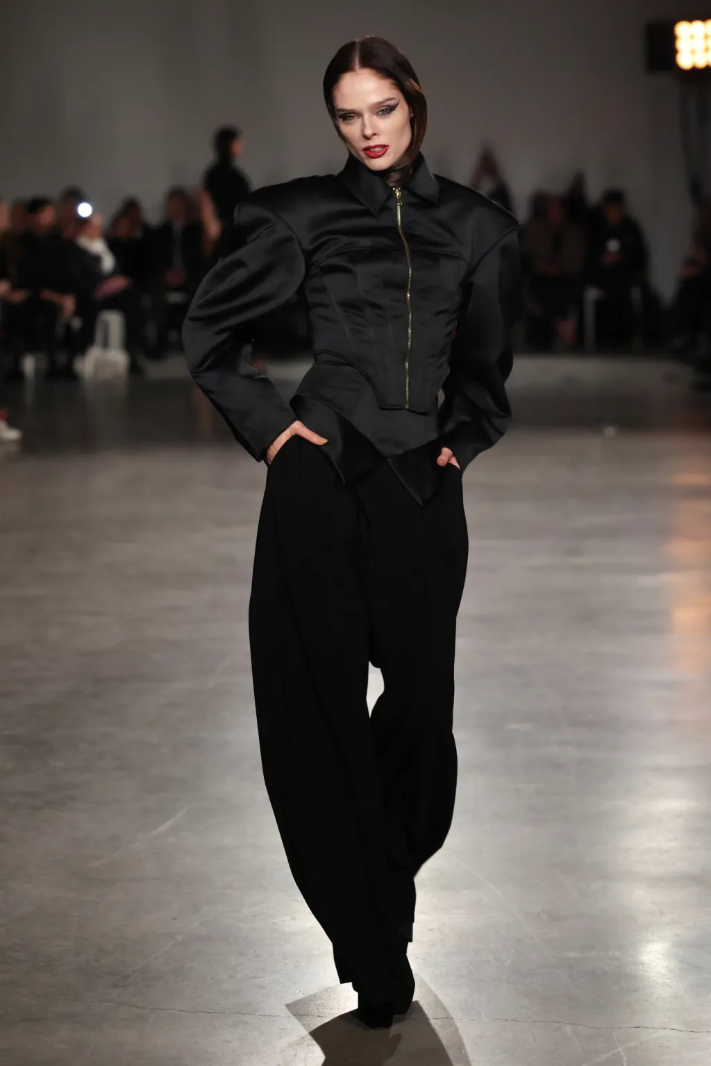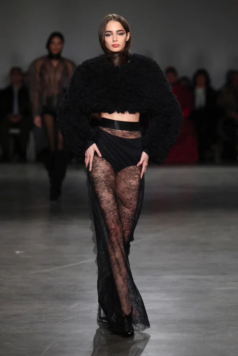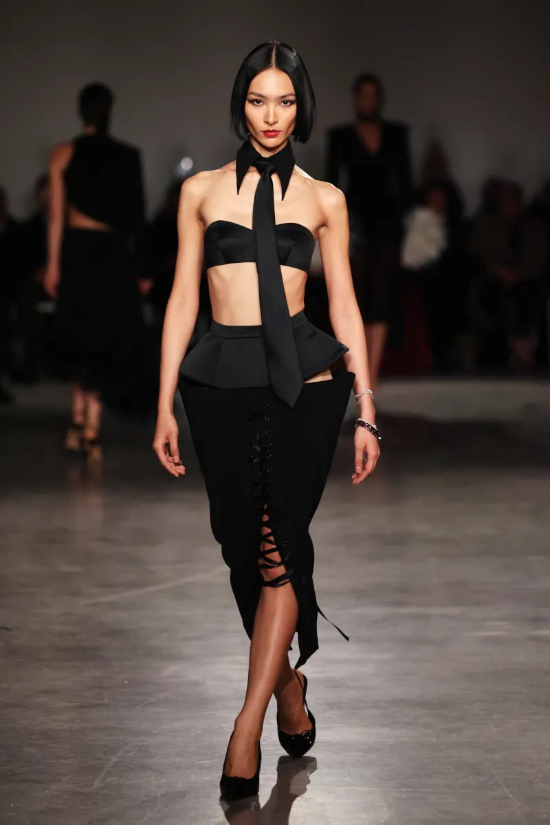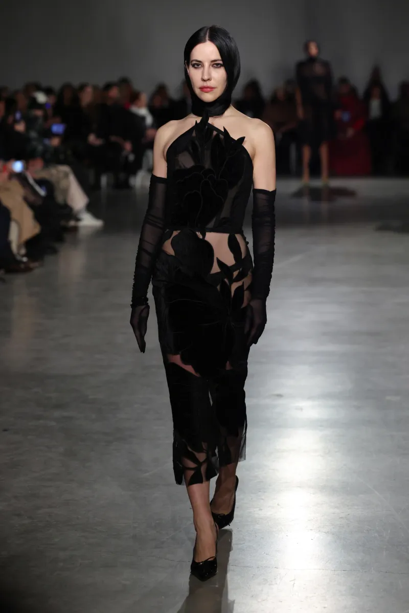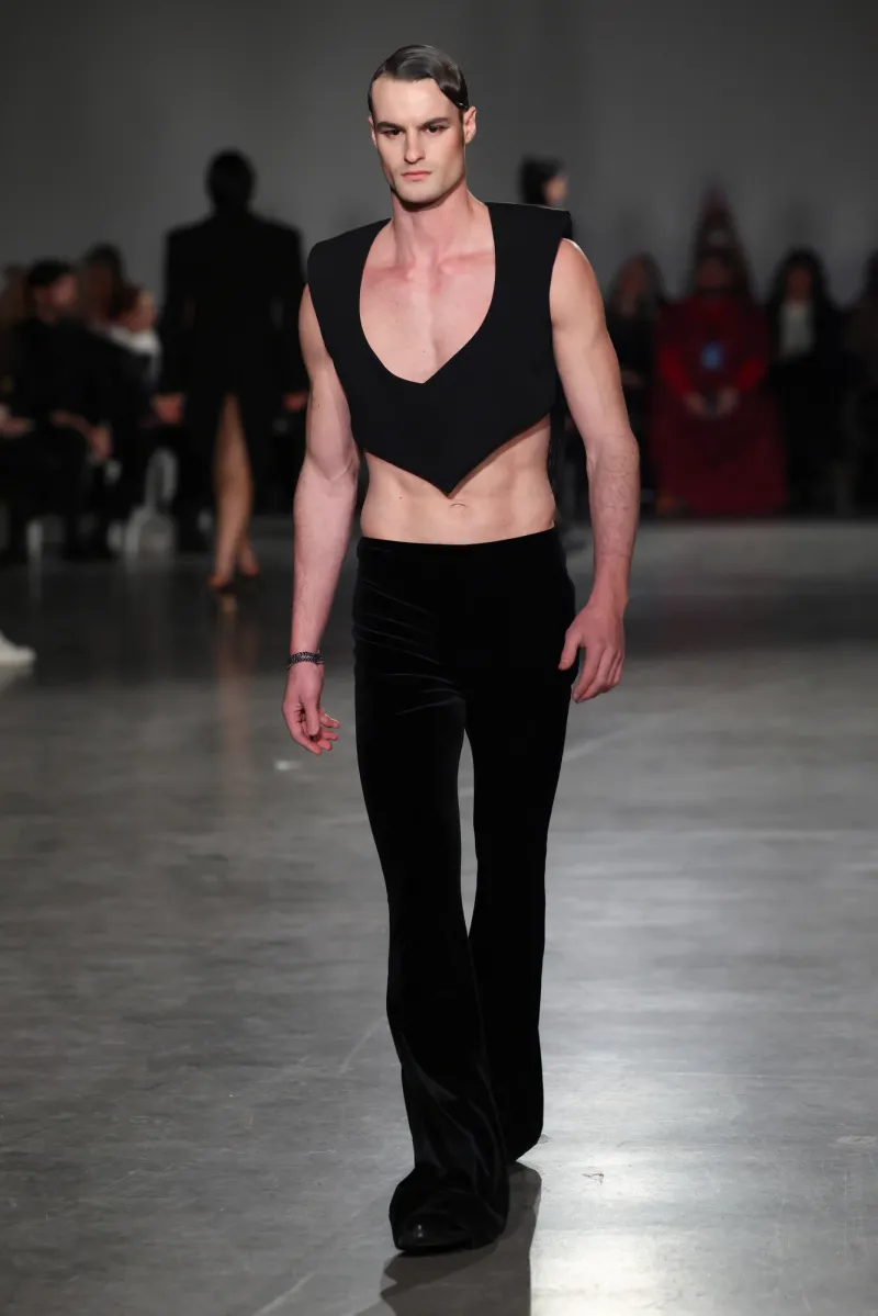 The palette hooks you slow: shadowy charcoals and inky obsidian suck you into mystery, then erupt into fiery crimson and liquid gold—like bursting from a stormy night into a golden sunrise party. The runway unfolded like a movie, each outfit ramping up the thrill.