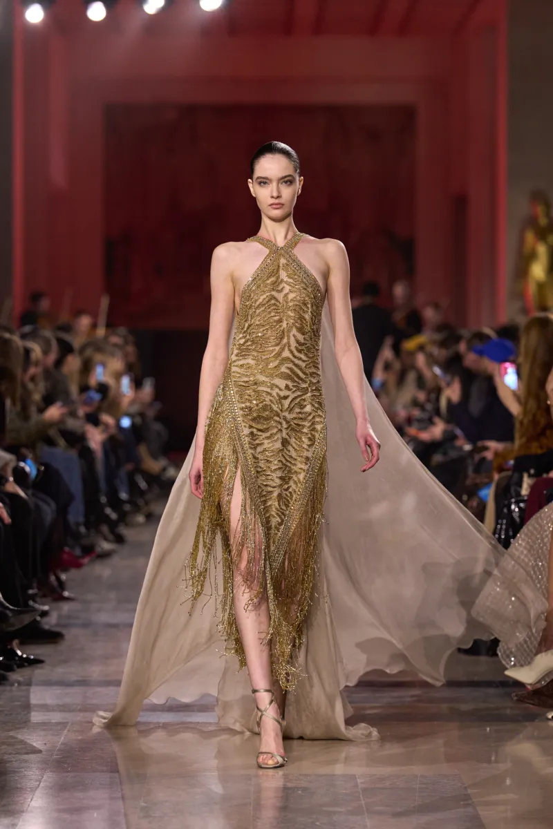 Elie Saab’s Spring/Summer 2026 Couture collection, presented at Paris Couture Week, was titled “Golden Summer Nights of ’71” and celebrated a rich blend of 1970s jet-set glamour and Art Deco refinement. Drawing inspiration from the carefree luxury of Mediterranean escapes between Milos and Marrakech, the collection imbued couture with a hedonistic yet elegant spirit — opulent yet surprisingly relaxed for haute couture.
