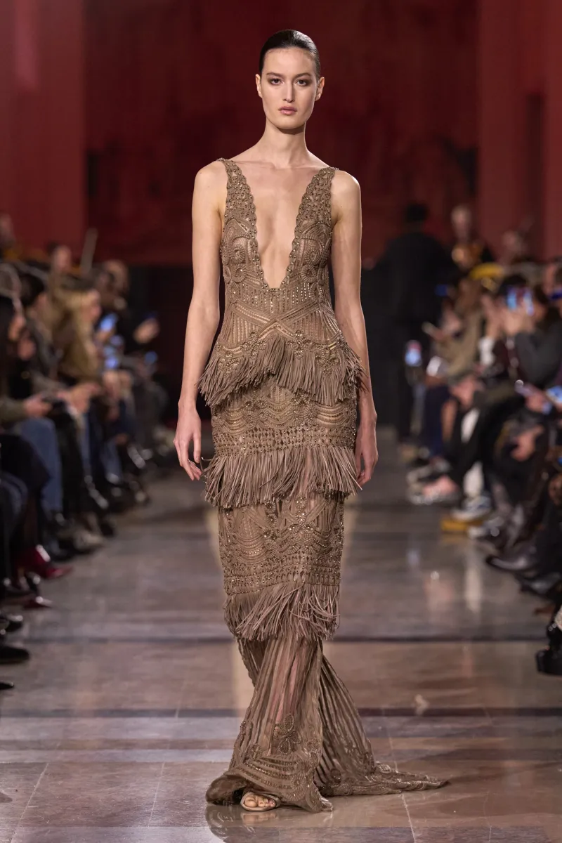 The runway featured a palette dominated by molten golds, bronze, and warm neutrals, occasionally punctuated by deep purple, with intricate beading, sequins, metallics, and graphic motifs that referenced both Art Deco geometry and bohemian ease. Layers of beadwork, flowing capes, and shimmering textures created a sensory tapestry, while silhouettes ranged from languid and full to body-skimming and sleek.