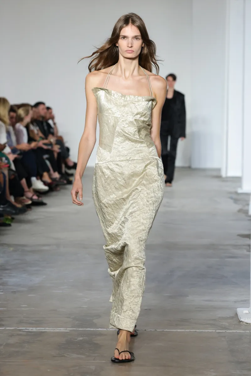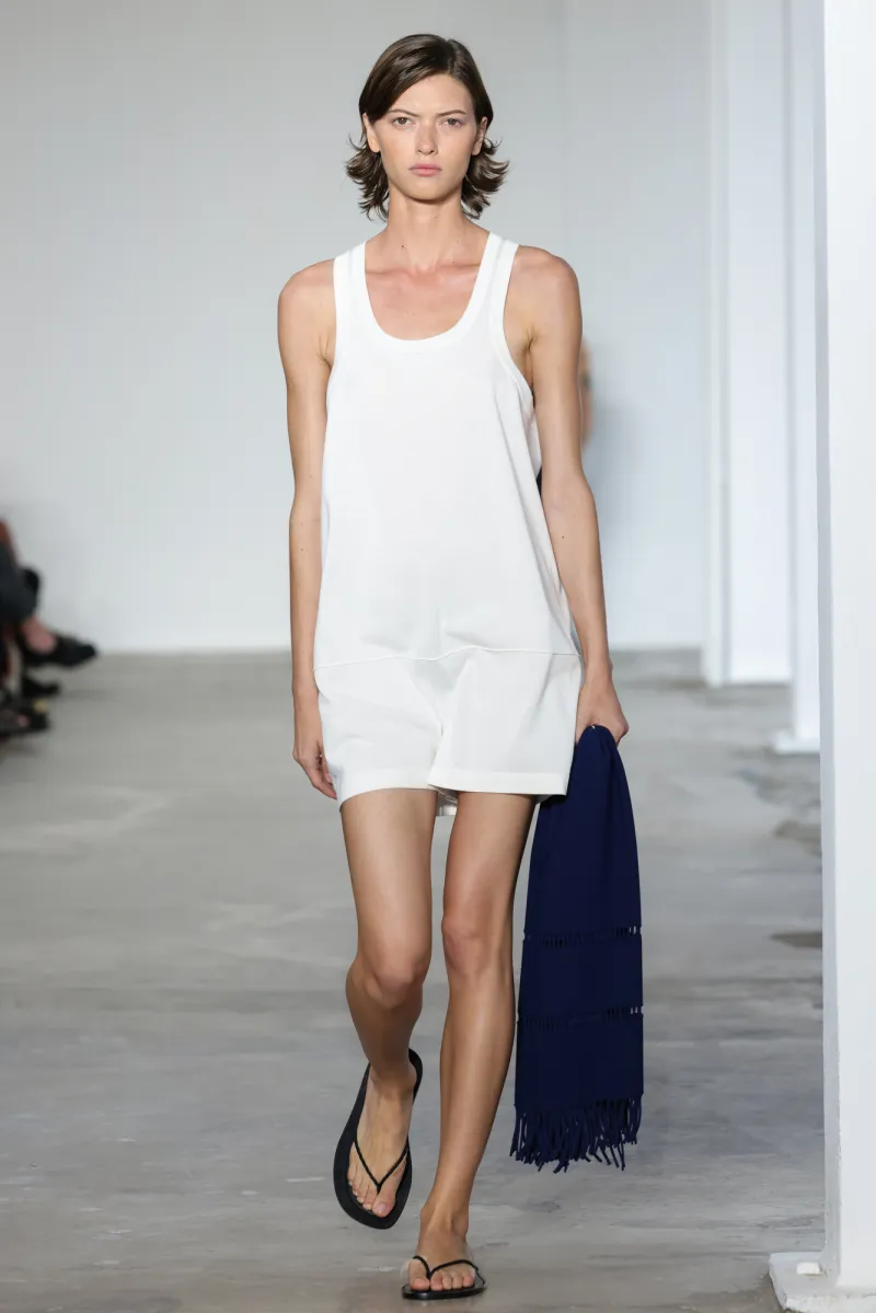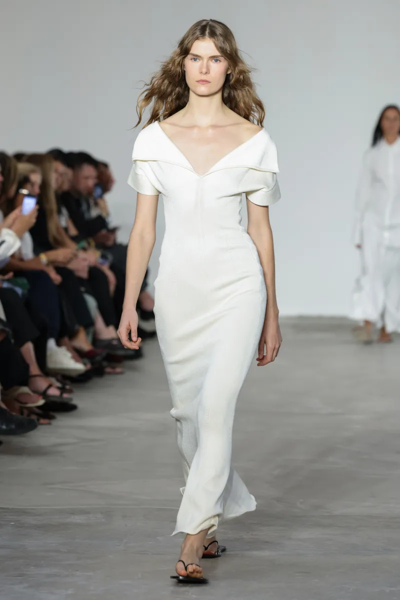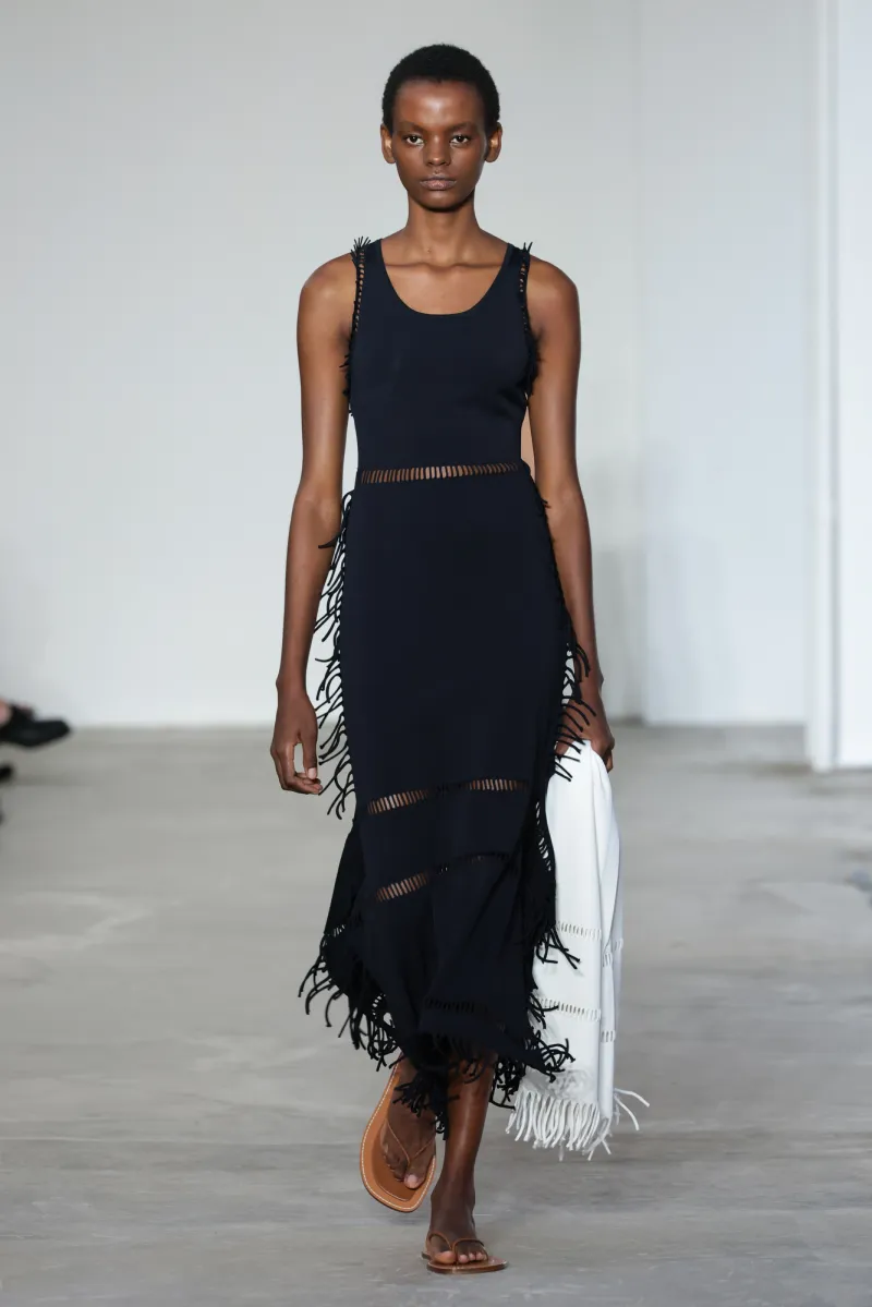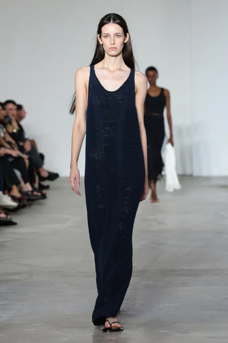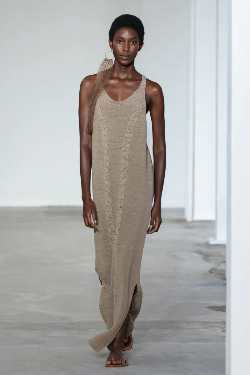 But even within the technical and structured, there was ease. Dresses draped like towels around models, hand-frayed edges suggesting salt-air texture, and flip-flop-like braided leather sandals under long dresses hemmed just above the ankle. For Howie, this collection was not about minimalism — she says, “I really think people are over stripping everything back. I think they want something that has a bit of soul or more design.”