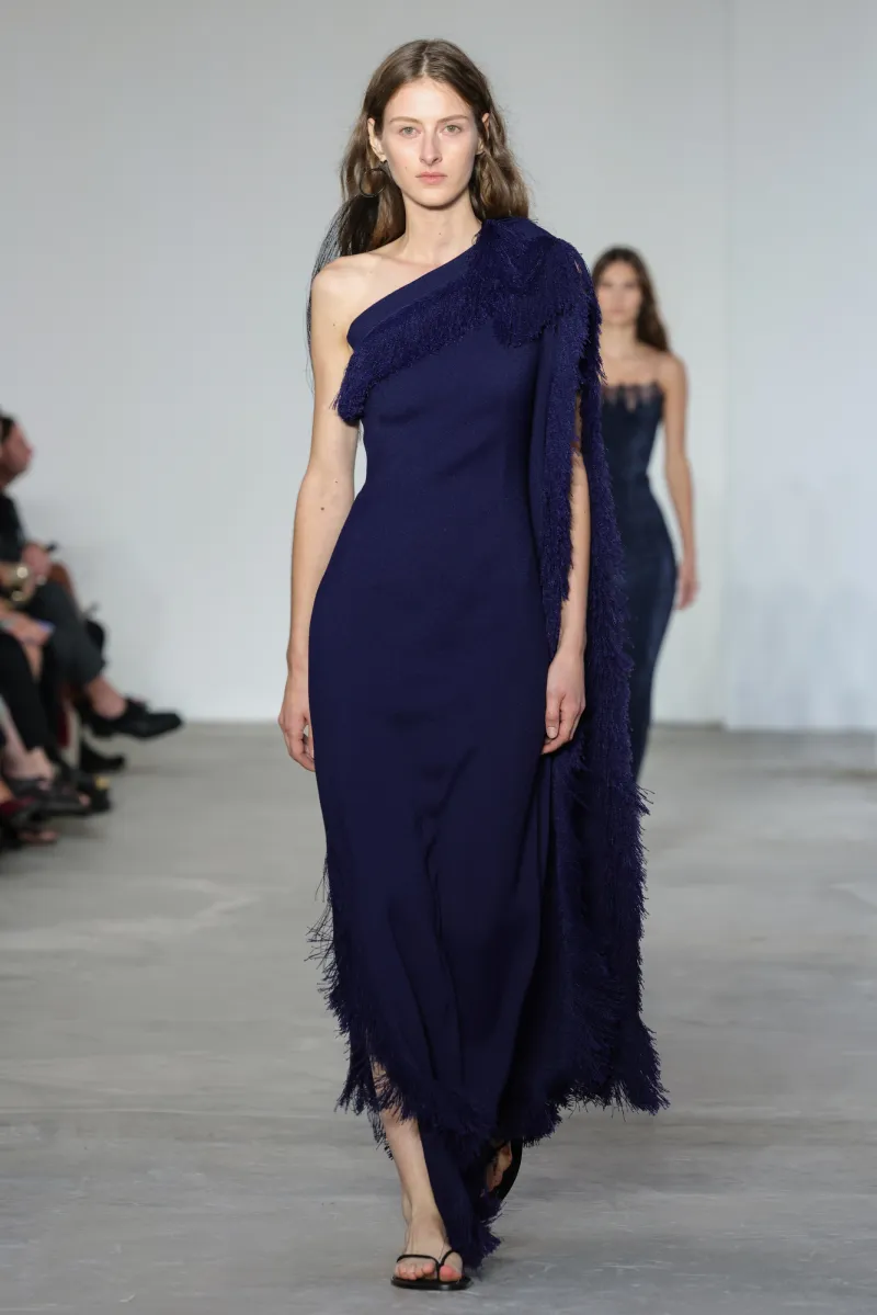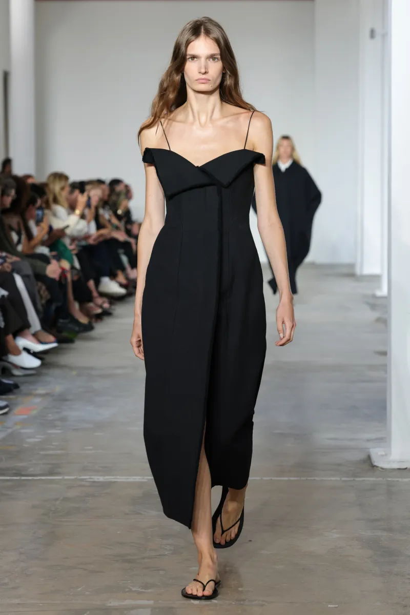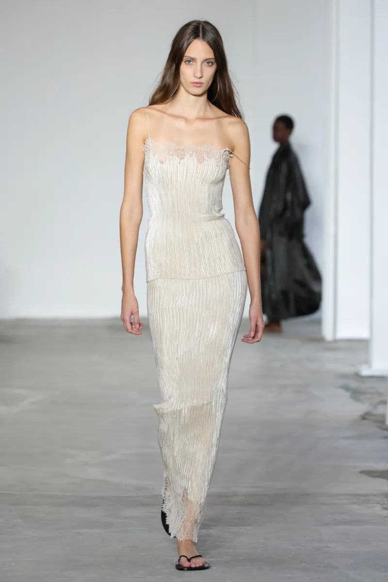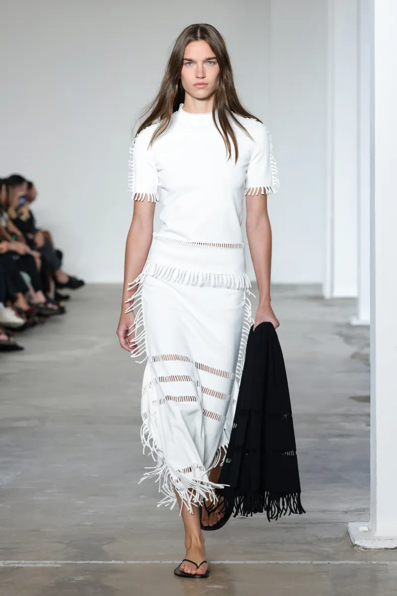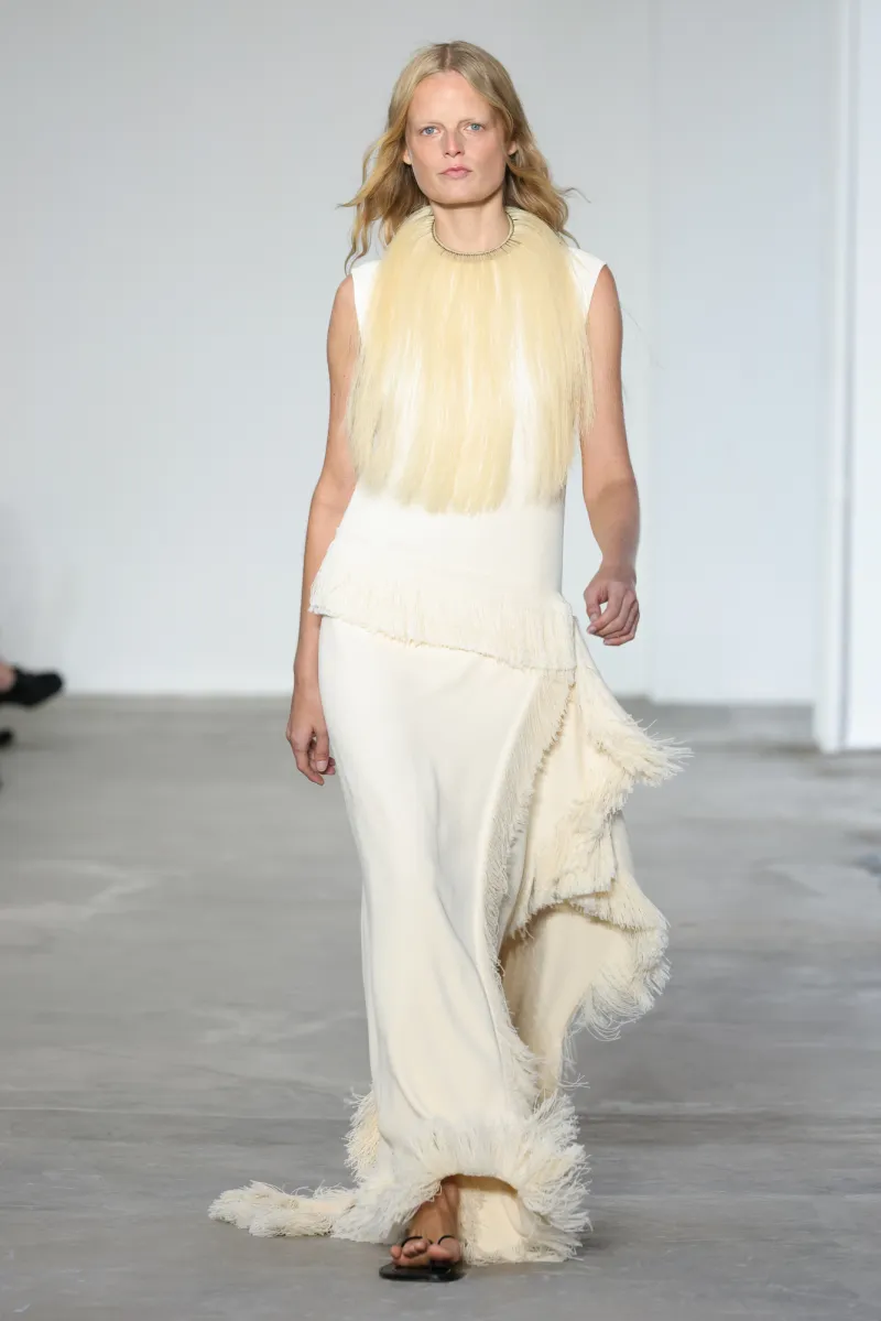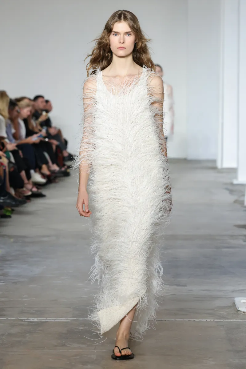 But even within the technical and structured, there was ease. Dresses draped like towels around models, hand-frayed edges suggesting salt-air texture, and flip-flop-like braided leather sandals under long dresses hemmed just above the ankle. For Howie, this collection was not about minimalism — she says, “I really think people are over stripping everything back. I think they want something that has a bit of soul or more design.”