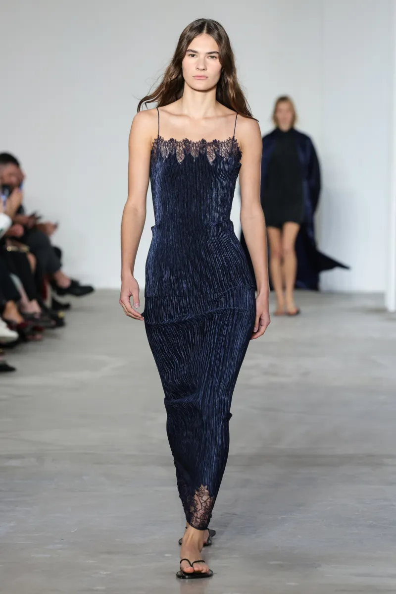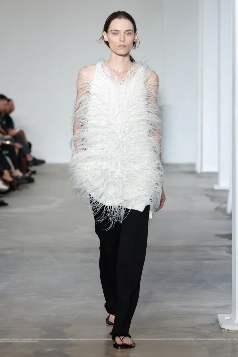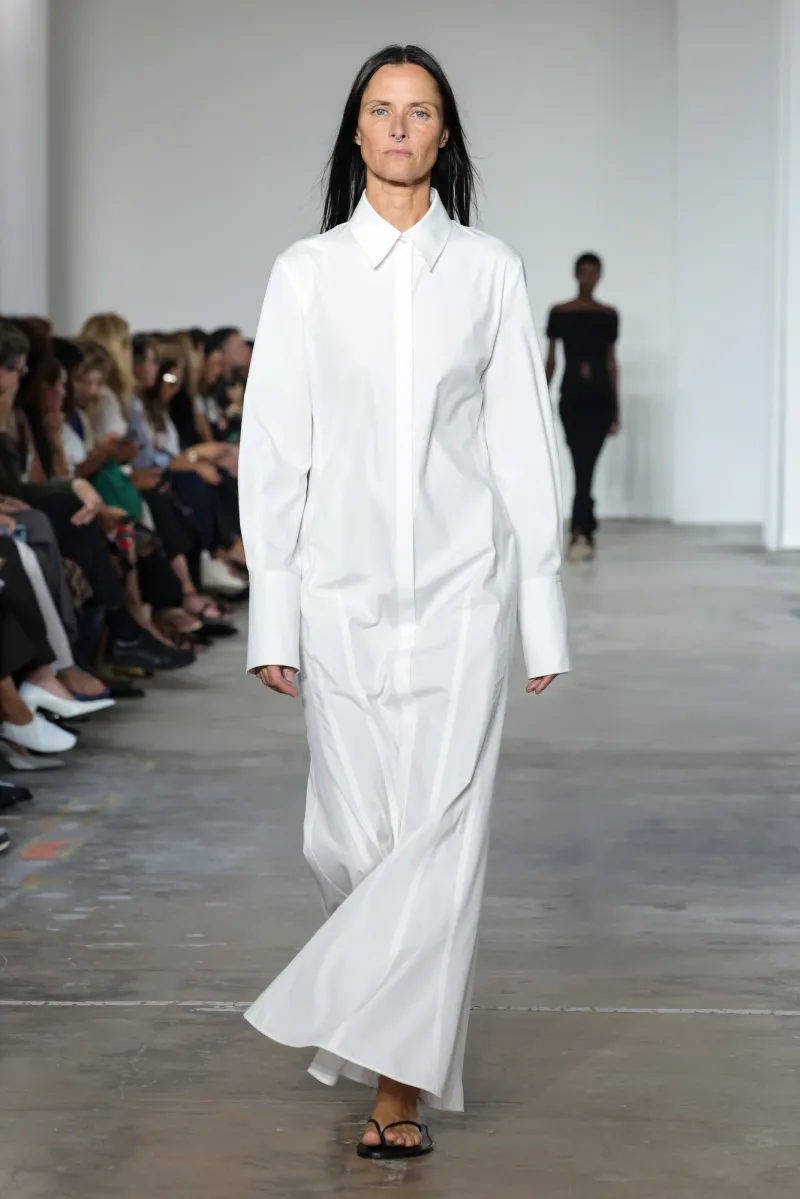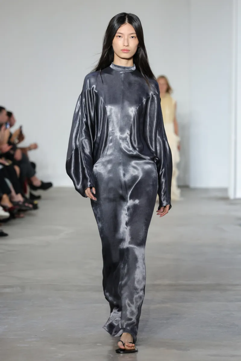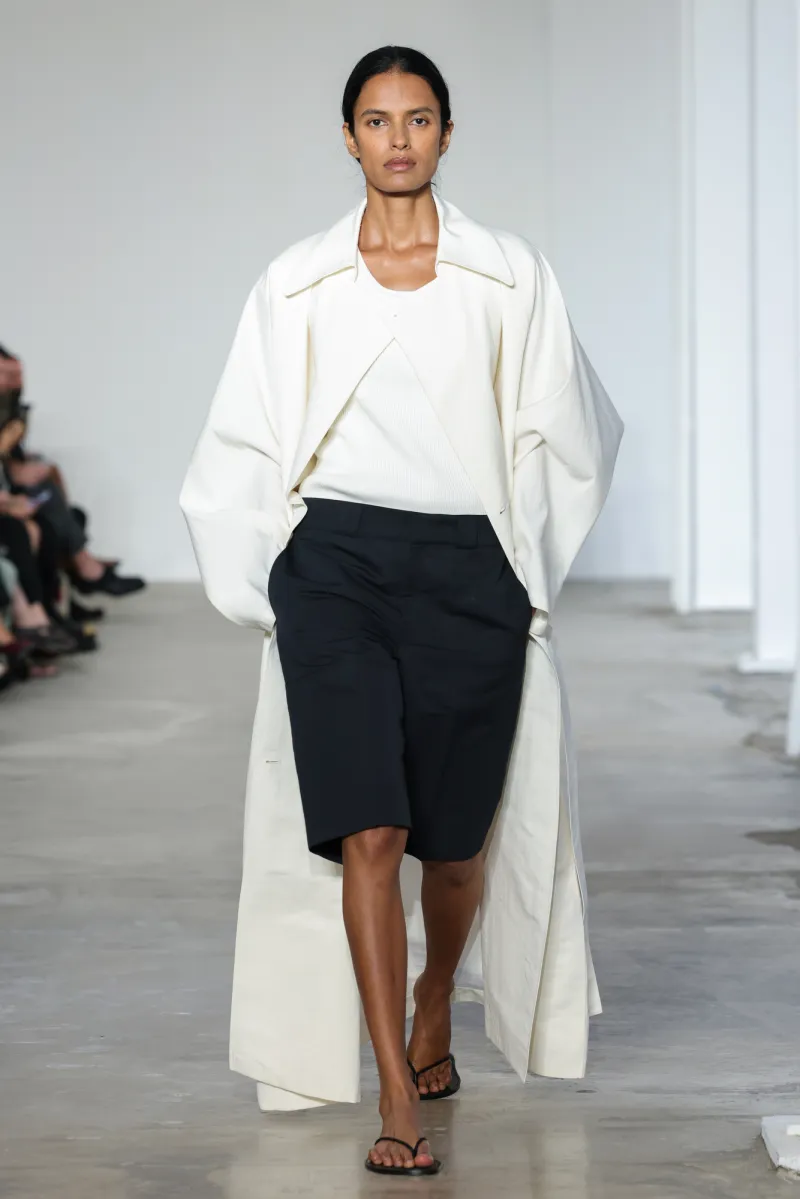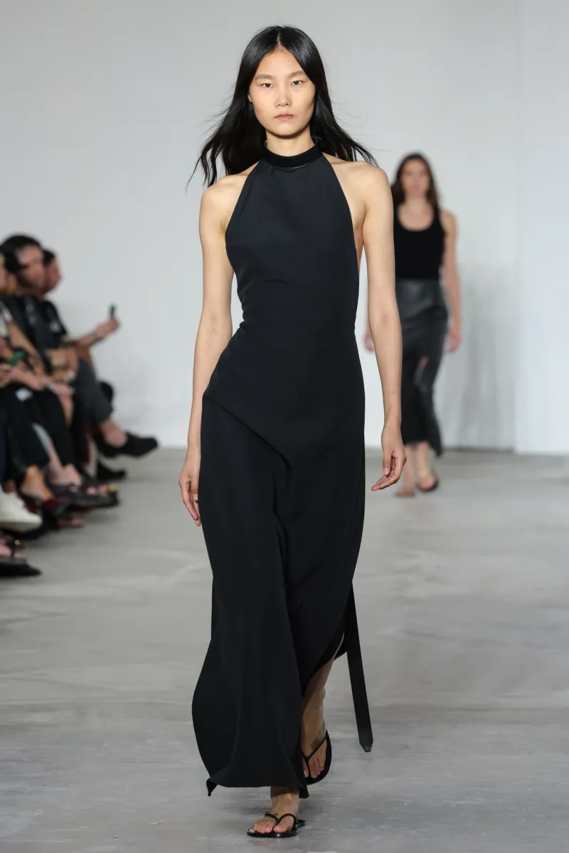 But even within the technical and structured, there was ease. Dresses draped like towels around models, hand-frayed edges suggesting salt-air texture, and flip-flop-like braided leather sandals under long dresses hemmed just above the ankle. For Howie, this collection was not about minimalism — she says, “I really think people are over stripping everything back. I think they want something that has a bit of soul or more design.”