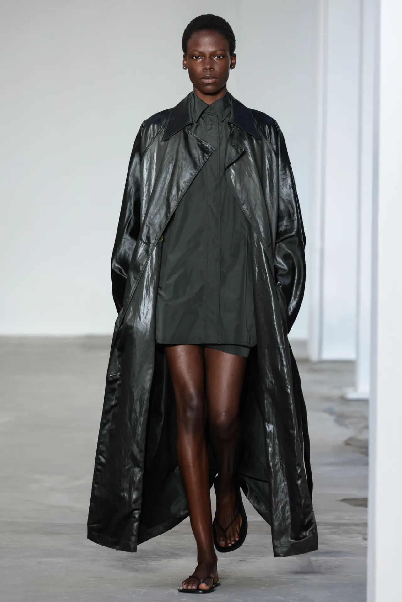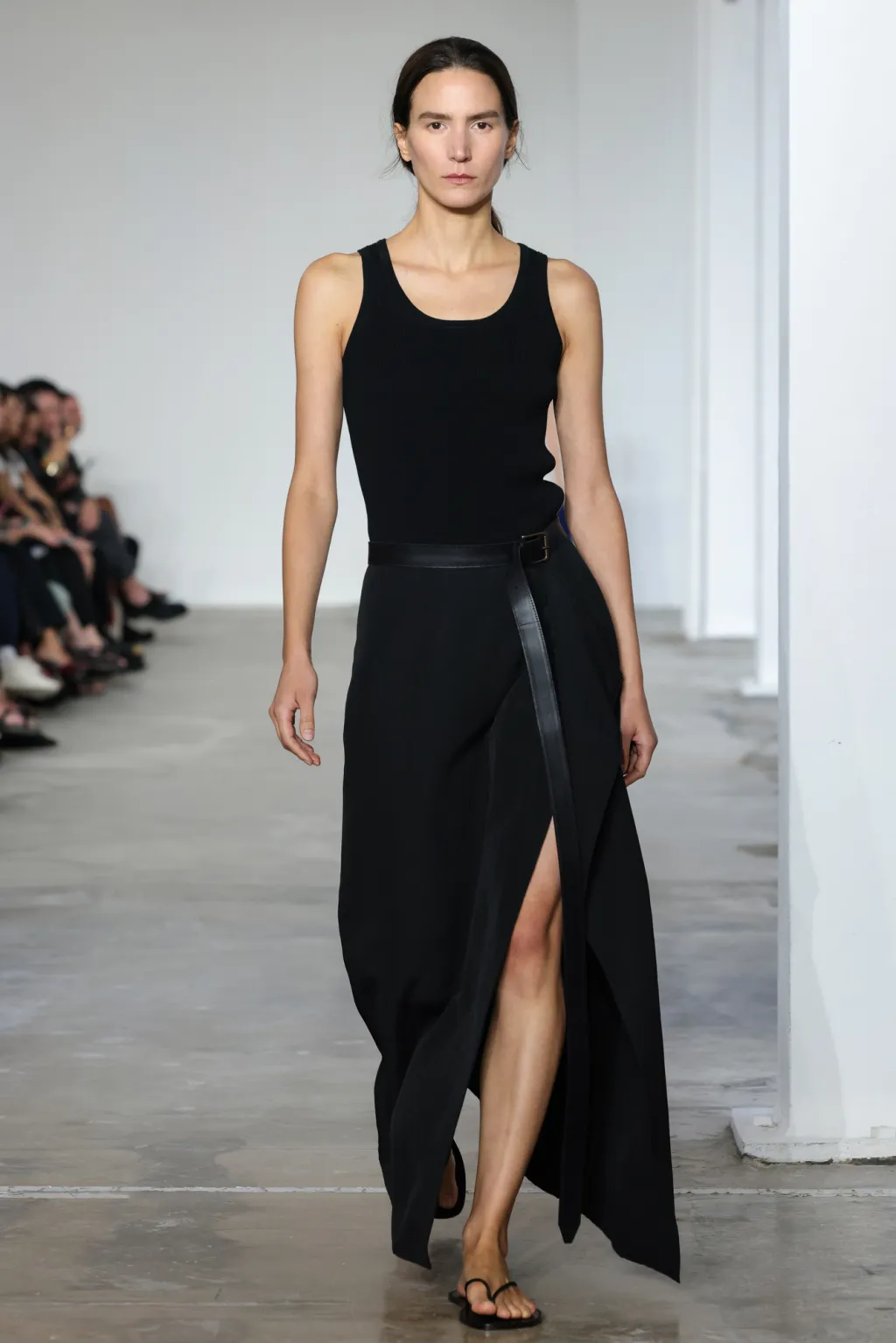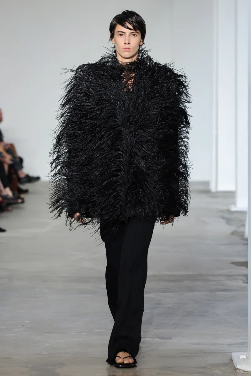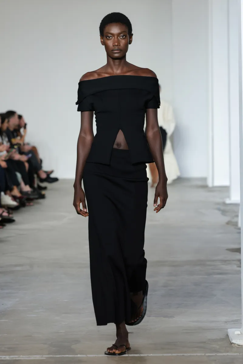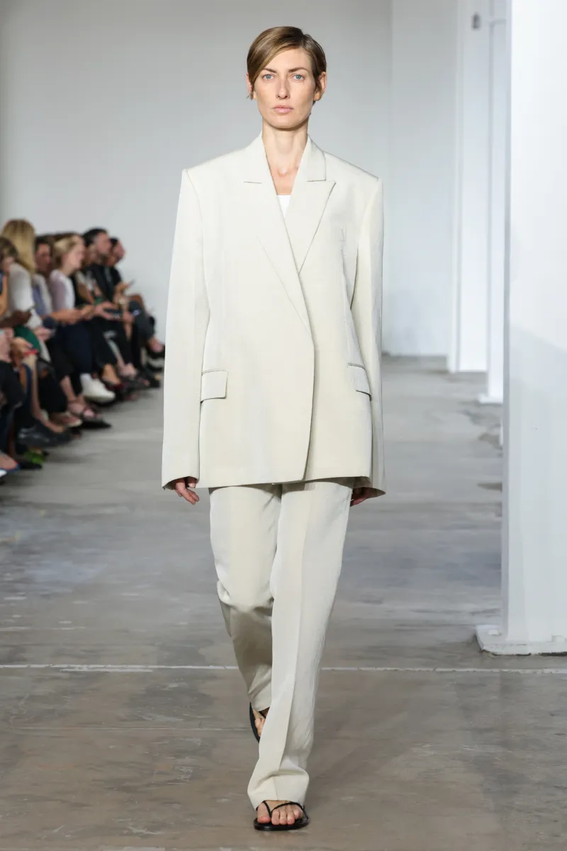 But even within the technical and structured, there was ease. Dresses draped like towels around models, hand-frayed edges suggesting salt-air texture, and flip-flop-like braided leather sandals under long dresses hemmed just above the ankle. For Howie, this collection was not about minimalism — she says, “I really think people are over stripping everything back. I think they want something that has a bit of soul or more design.”