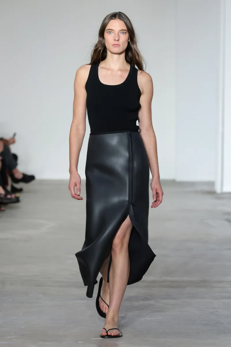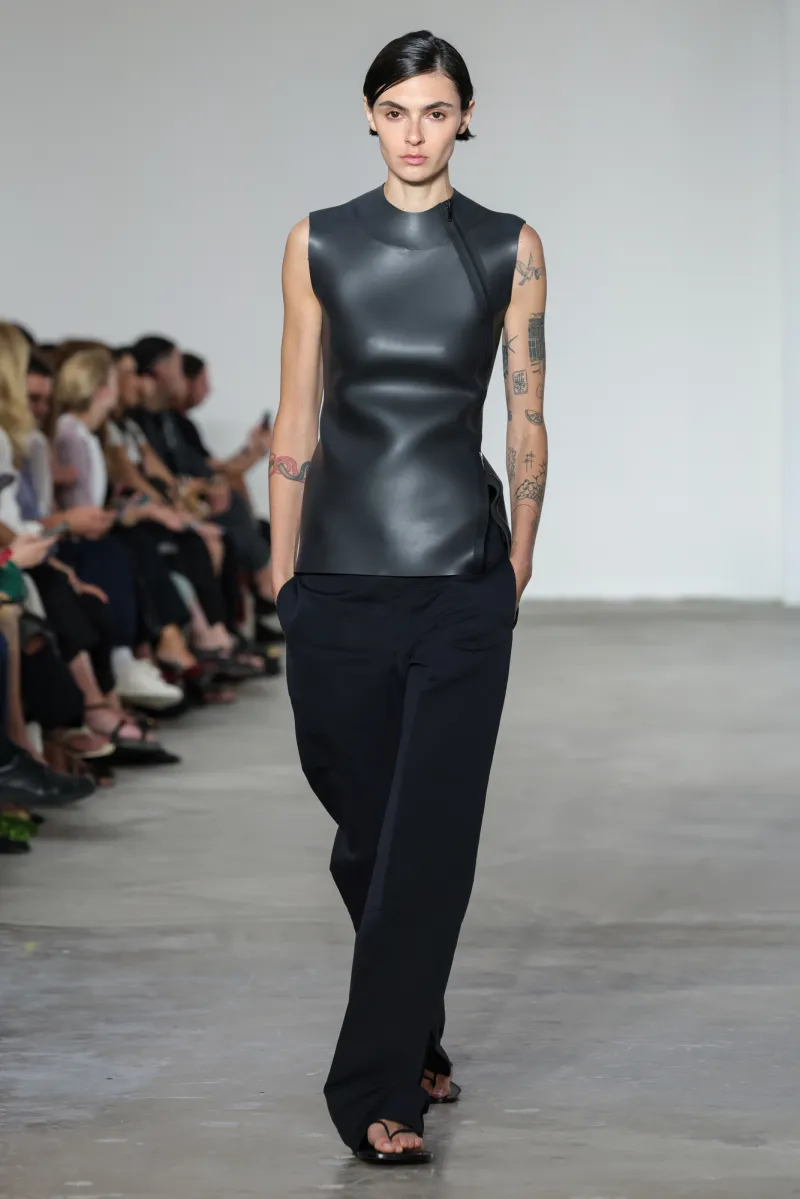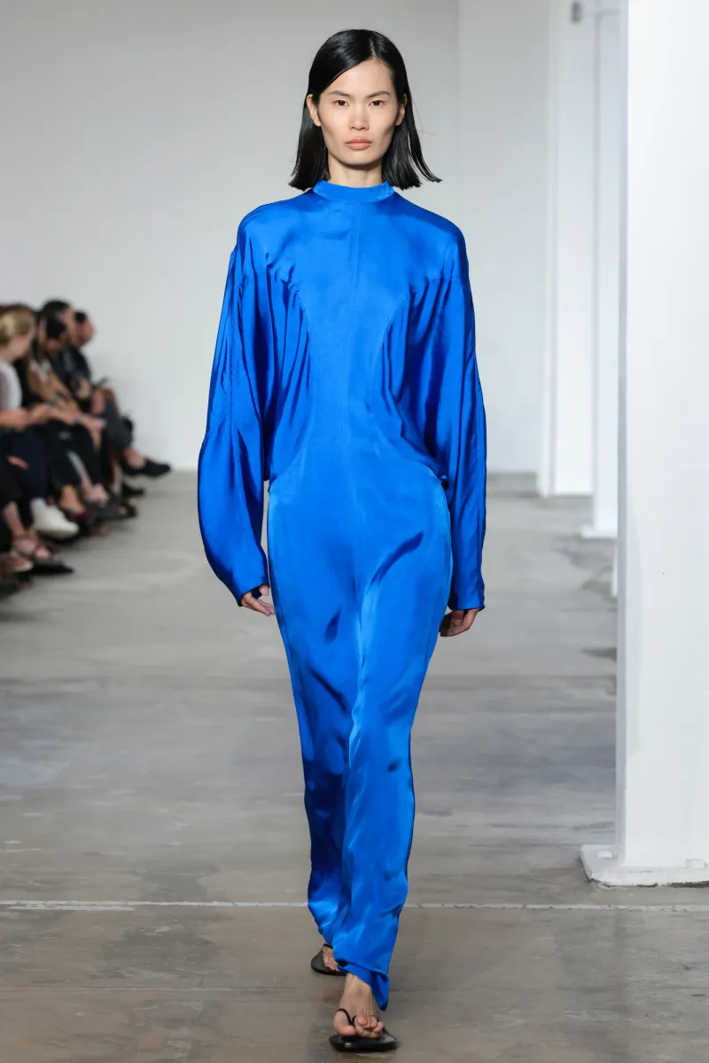 That raw natural environment shaped the collection: molded rubberized pieces with neoprene linings, referencing wetsuits and surf gear. A sleek satin cobalt dress used surf stitching — fluid in silhouette but technical in detail.