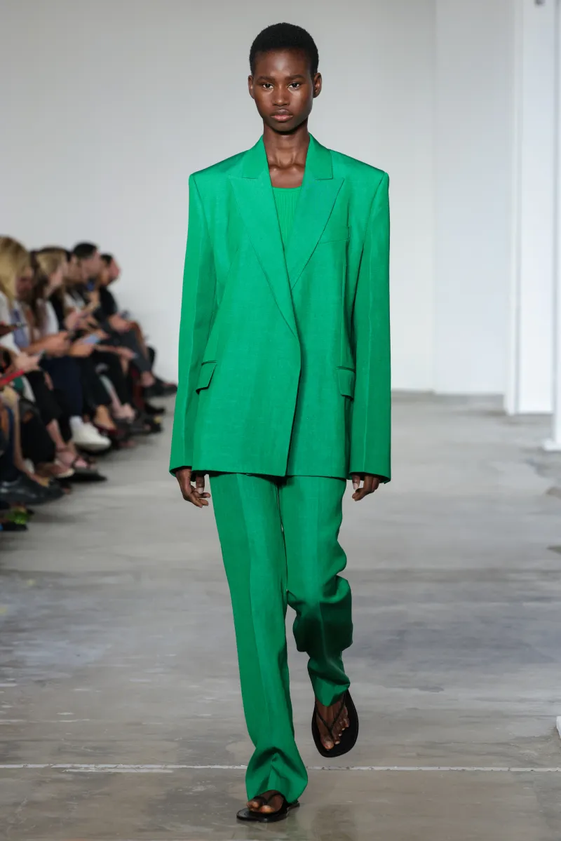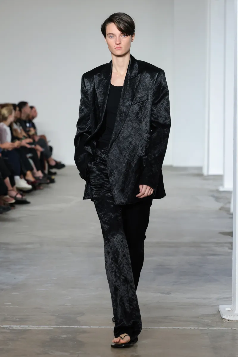 The tailoring, too, leaned into precision: trousers and matching blazers crafted by menswear-heritage tailors, linen and silk combinations, crisp cuts in metallic cotton that caught light like water. “If we’re doing a black suit, we want to make sure ours stand out,” Howie explains.