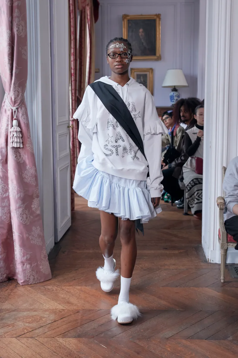 Each piece had a twist, with the fashion often topped off with tiaras. The jersey hoodie came with a little cotton ruffle detail in the back. Star necklace designs bedecked some jackets and shirts. Handbags appeared in fluffy sheep forms, like clutches out of a dream. Other slumber details included sleeping masks serving as head pieces or scarves.