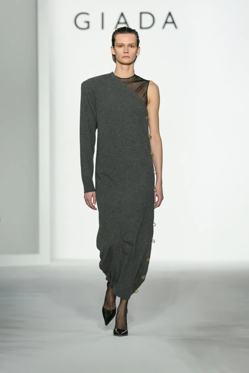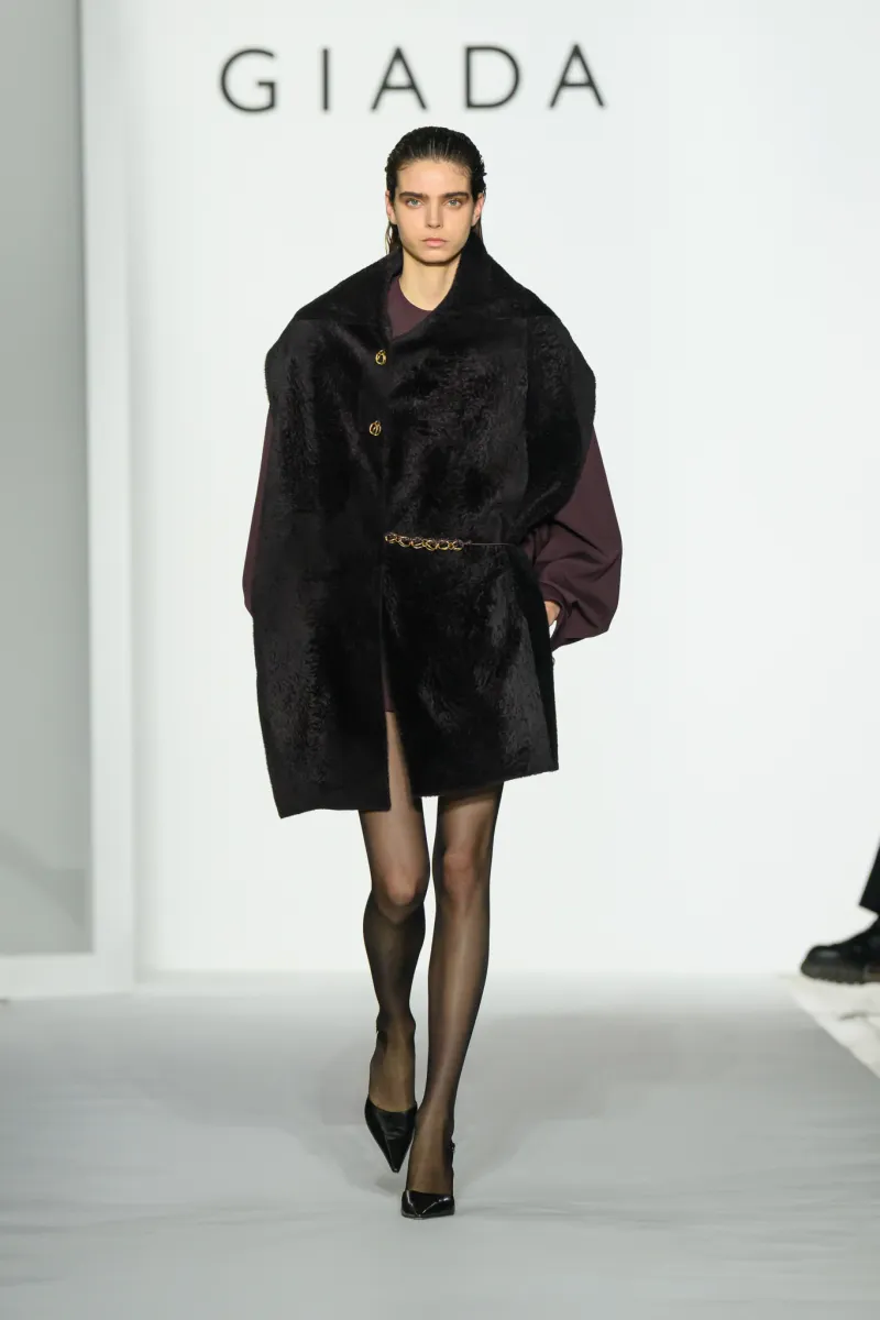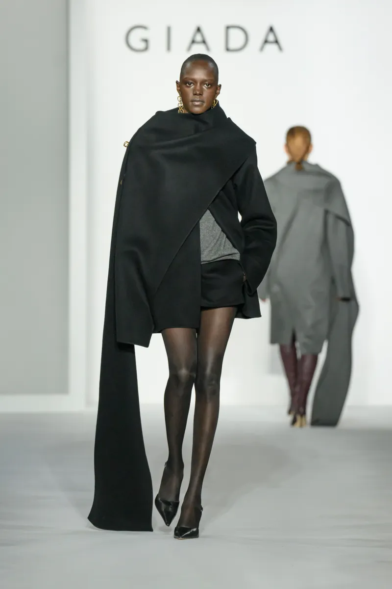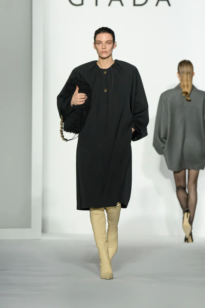 Other tactile surfaces included chenille for sweaters and knit dresses with bold, structured shoulders, and a black coat and slipdress with 3D embroideries shaped like orchids, the house flower. The embroideries were done by hand using traditional Chinese methods, a nod to Giada’s owners, Redstone Haute Couture, which is based in Shenzhen.