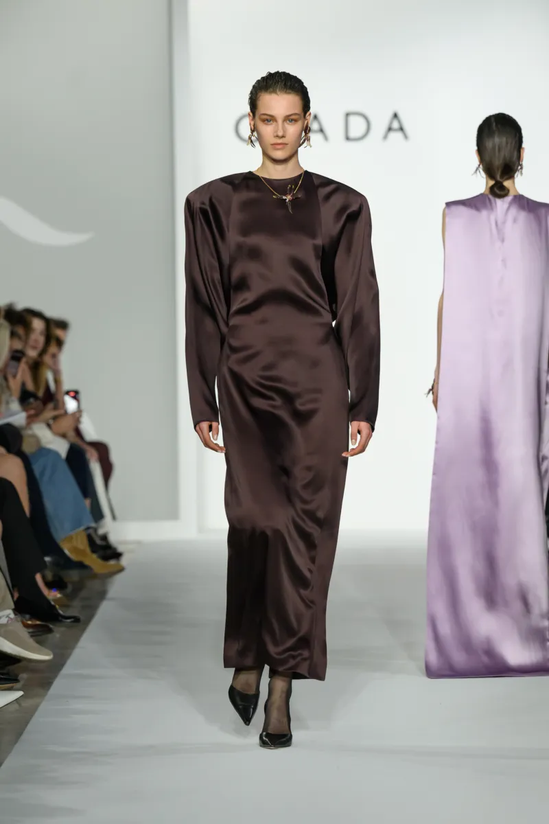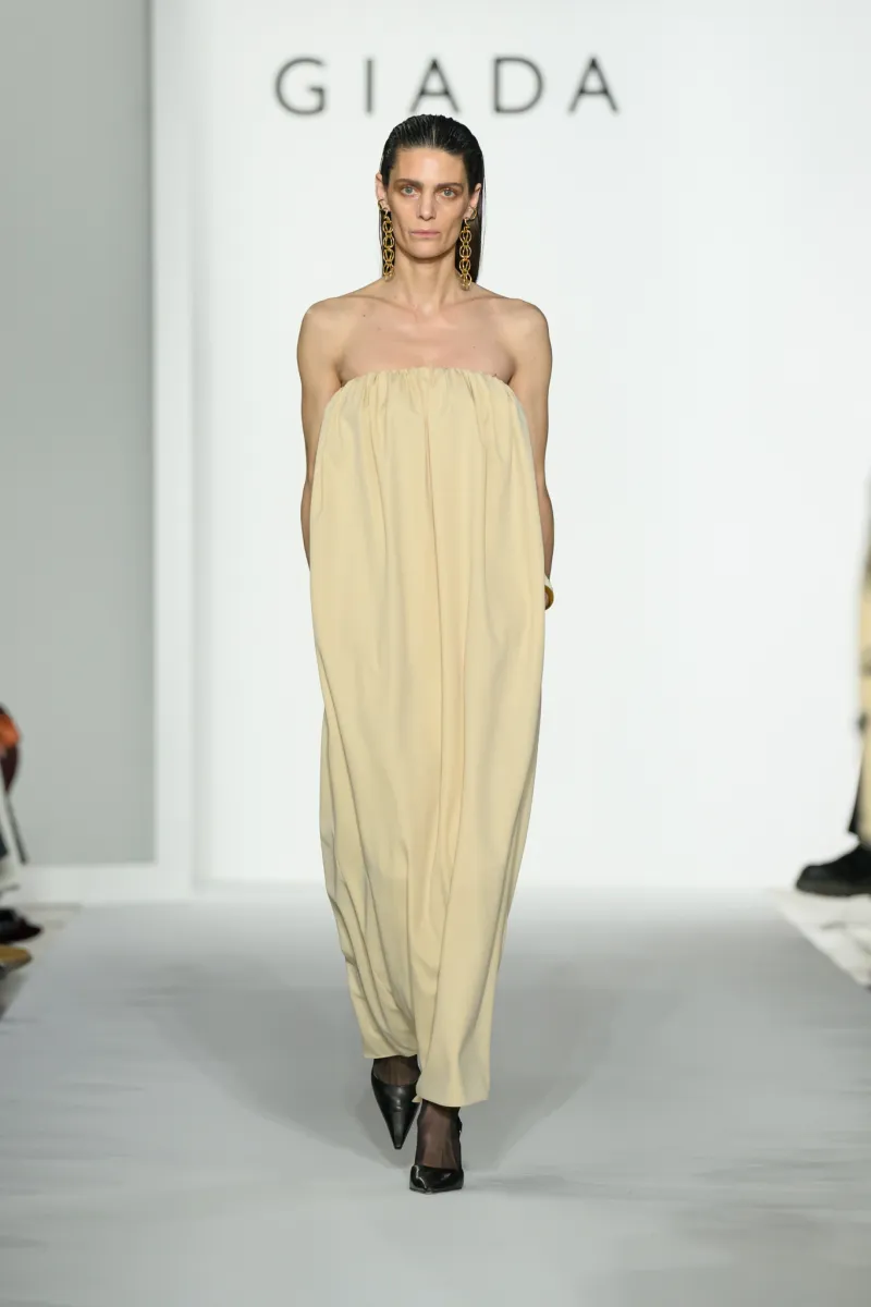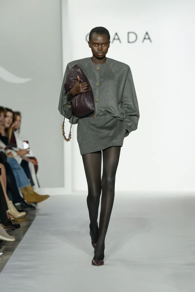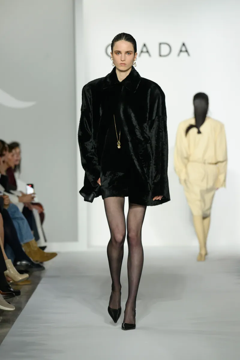 Other tactile surfaces included chenille for sweaters and knit dresses with bold, structured shoulders, and a black coat and slipdress with 3D embroideries shaped like orchids, the house flower. The embroideries were done by hand using traditional Chinese methods, a nod to Giada’s owners, Redstone Haute Couture, which is based in Shenzhen.