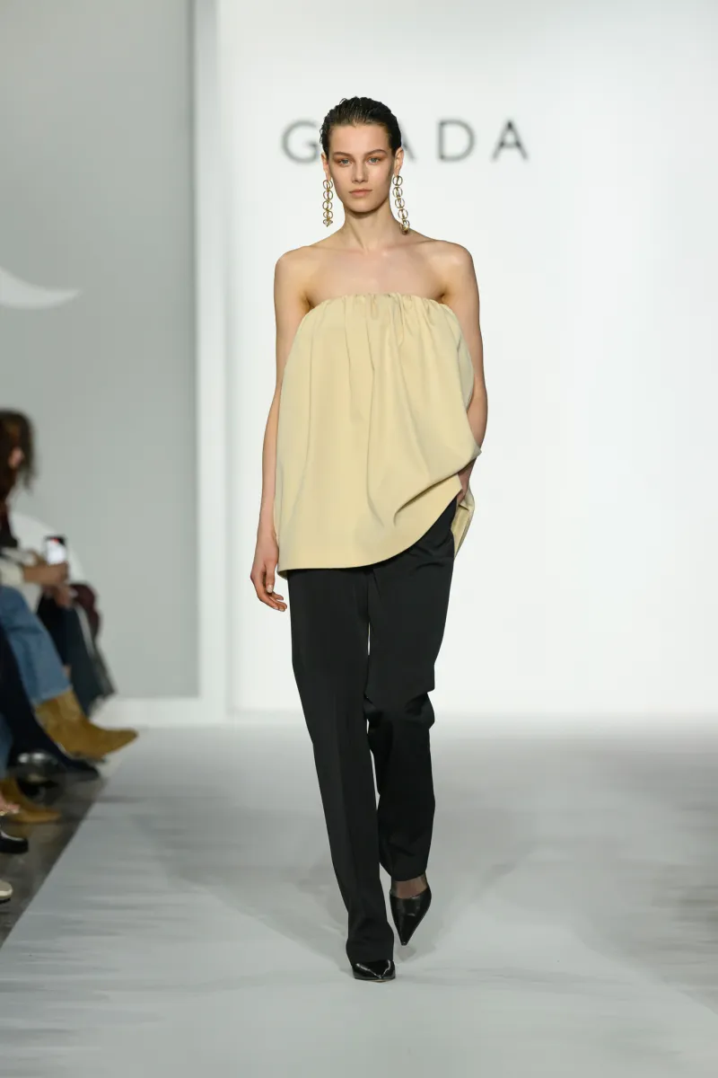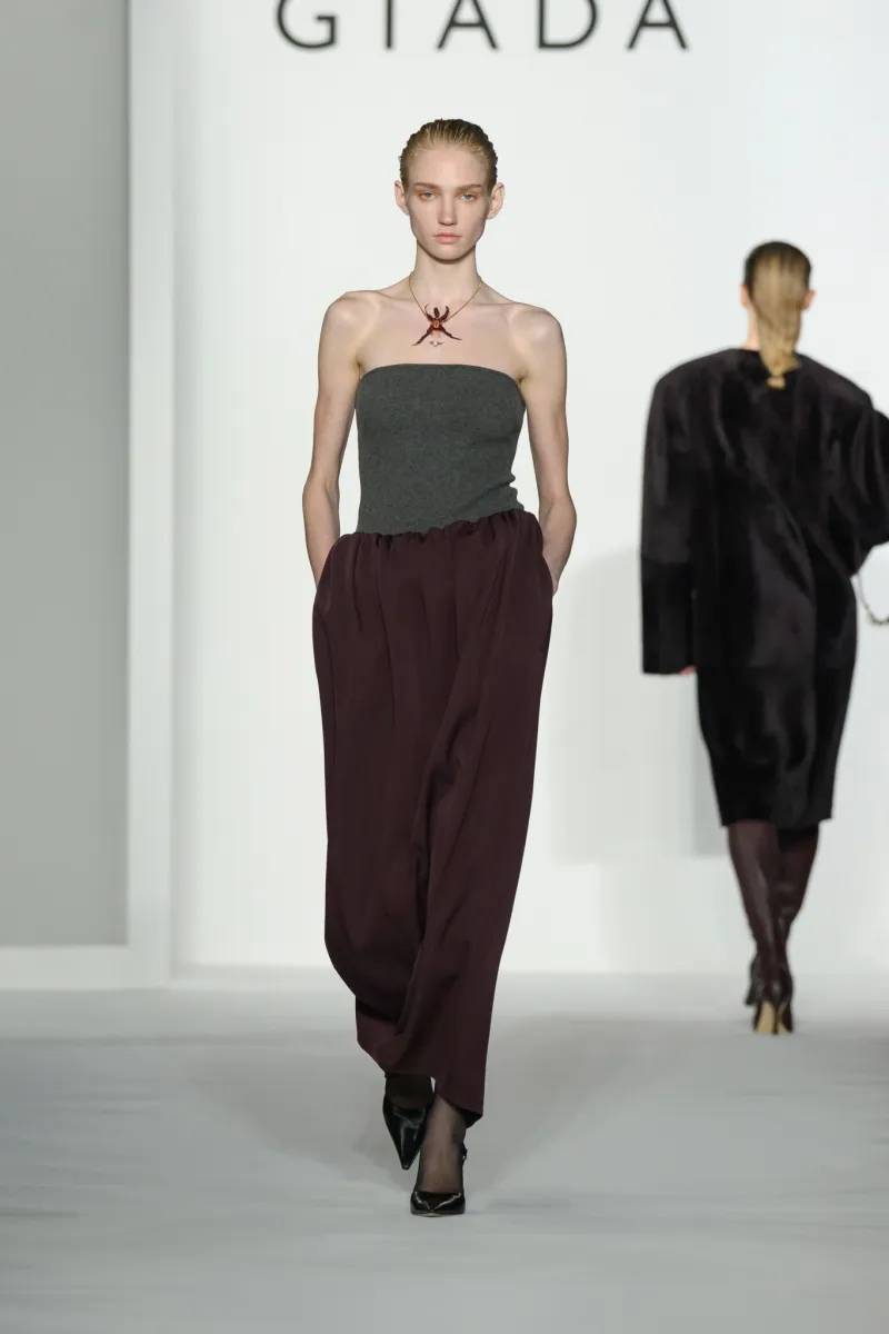Gabriele Colangelo is back on the runway with a sensual, tactile collection that was less formal than in past seasons. He packed it full of soft knits made from cashmere, sometimes blended with silk and wool, glossy shaved shearling coats, and even curly shearling handbags as cuddly as a cockapoo.