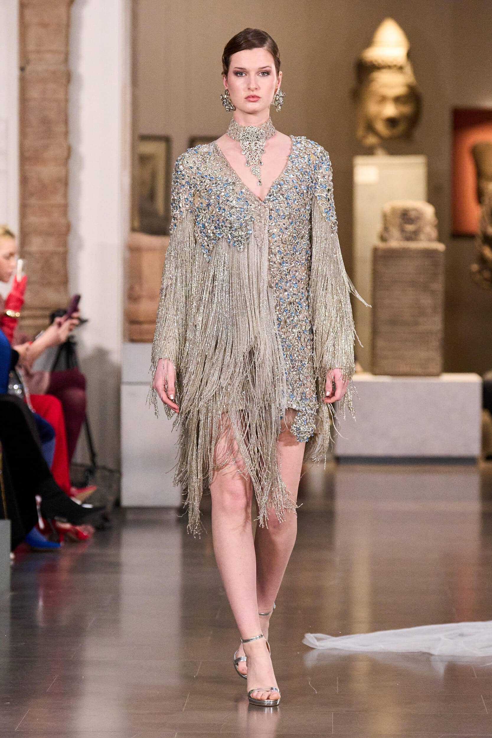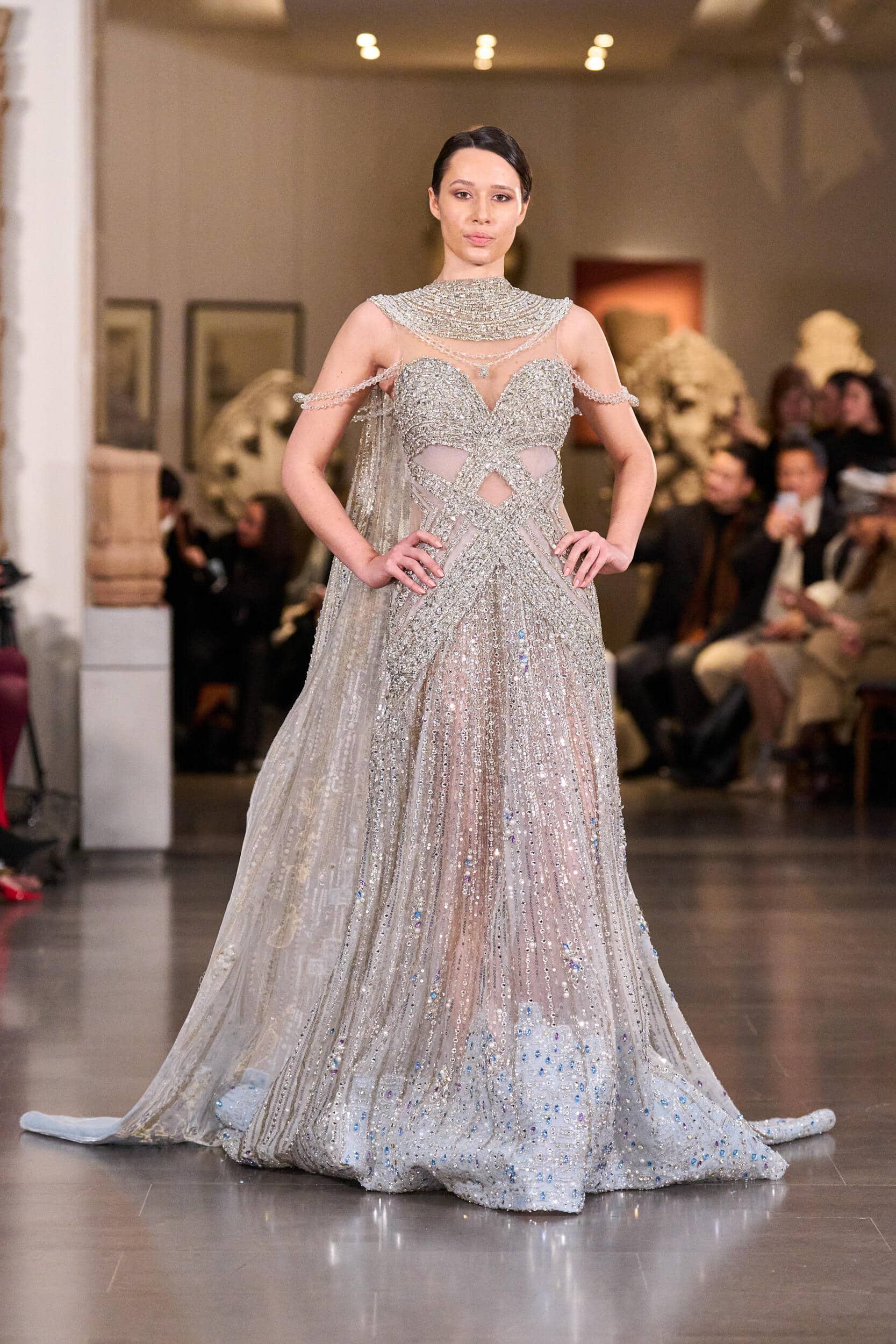 The runway unfolds with sweeping gowns, voluminous skirts, and sculpted corsetry, each piece meticulously crafted to command attention. Luxurious fabrics—silk satin, organza, tulle, and velvet—are adorned with intricate crystal embellishments, heavy embroidery, and shimmering appliqués that reflect light with every movement.
