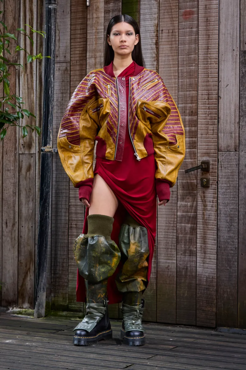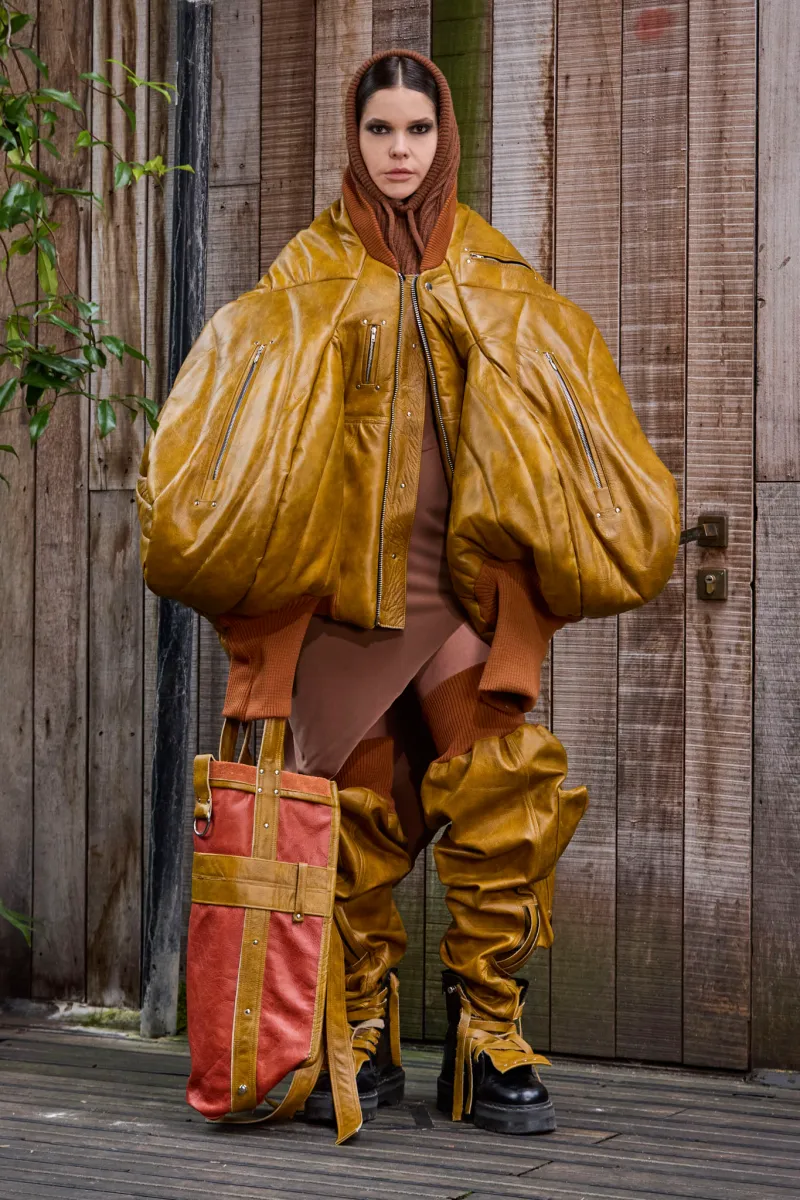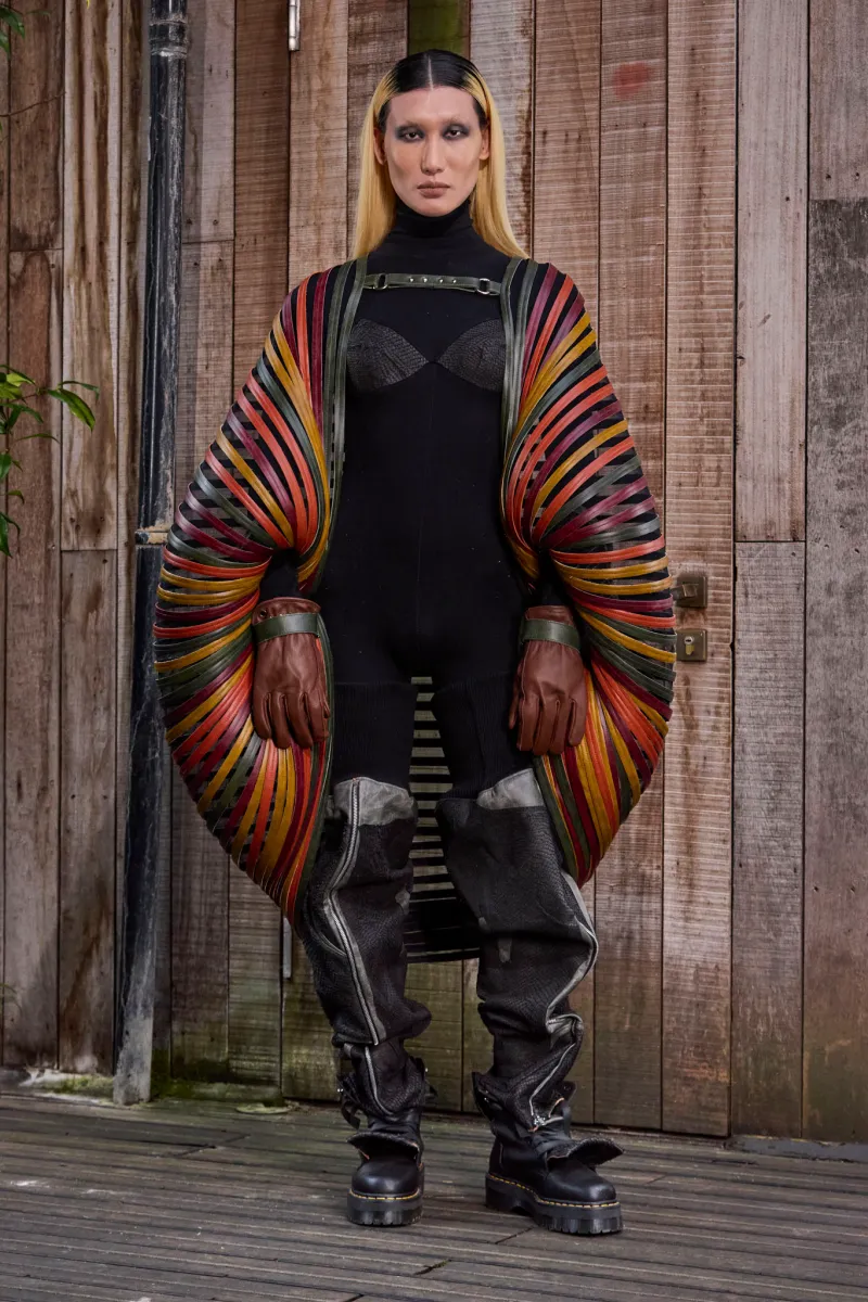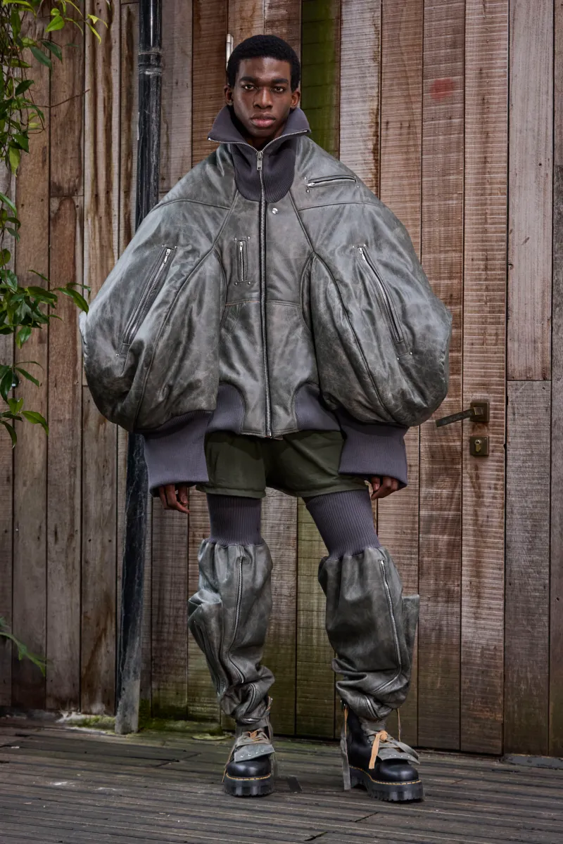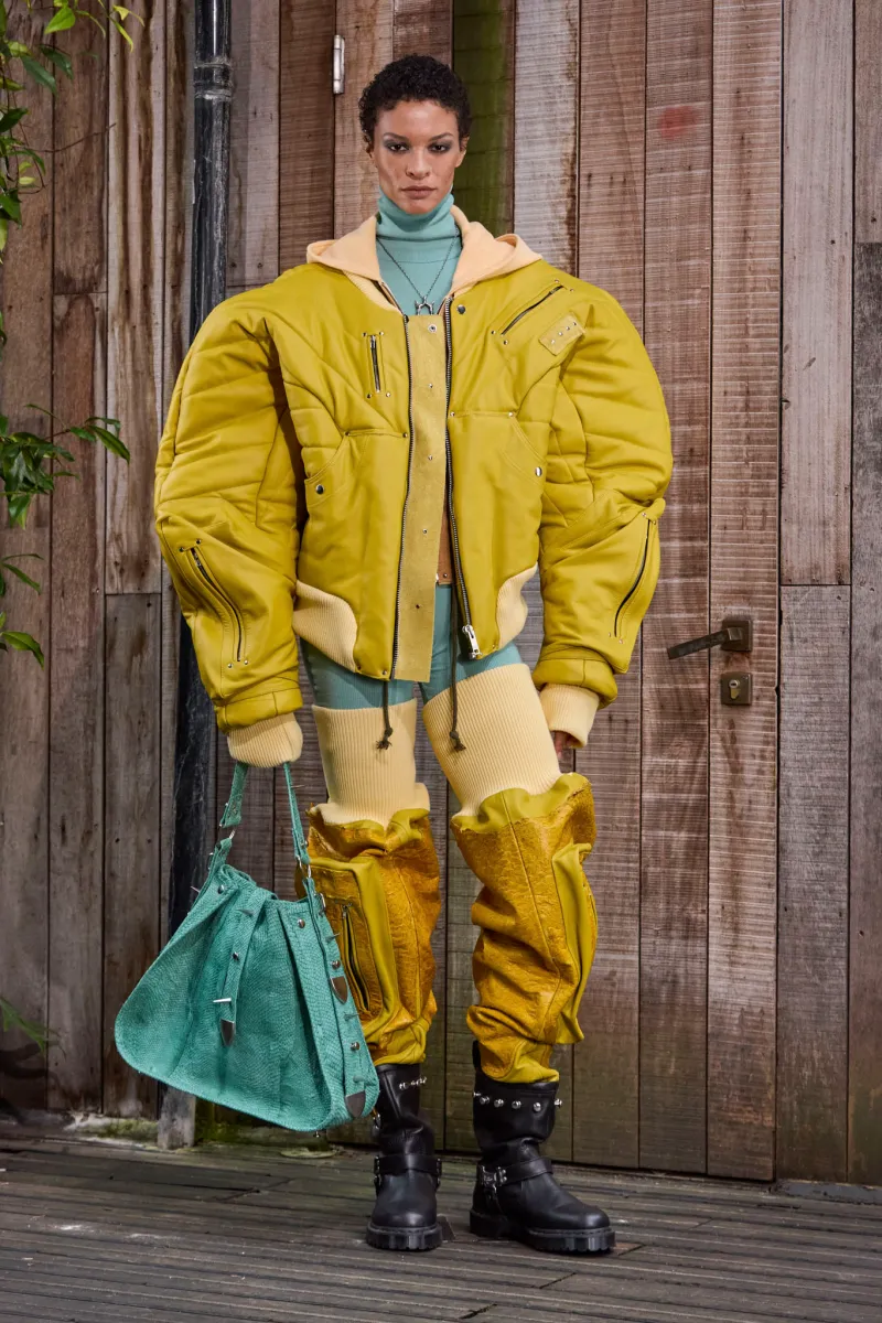 Layering plays a key role, with garments styled to build depth without overwhelming the look. Neutral tones—ranging from deep blacks and charcoals to muted earth shades—anchor the collection, allowing texture and construction to take center stage. Subtle fabric contrasts, including wool, cotton blends, and technical materials, add dimension while staying within the minimalist framework.
