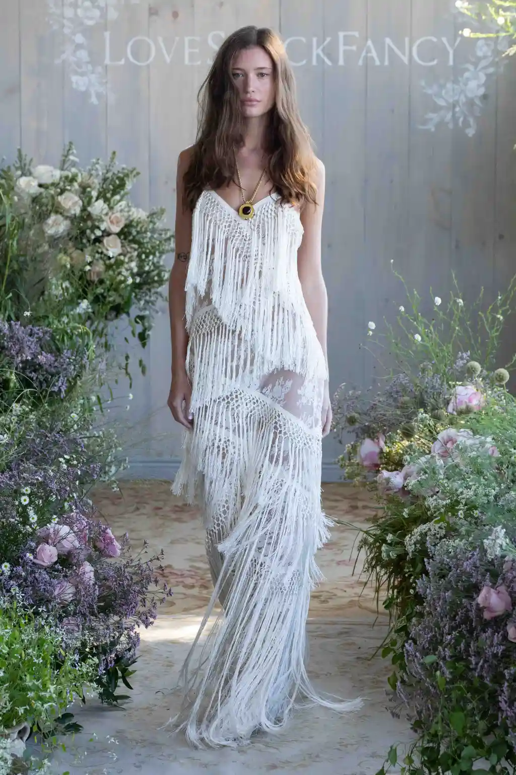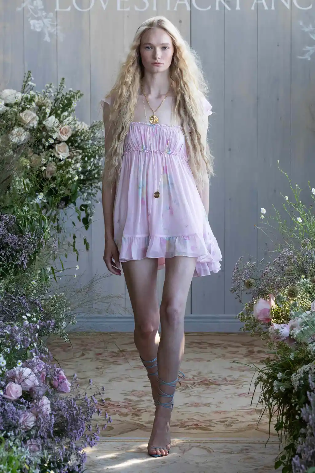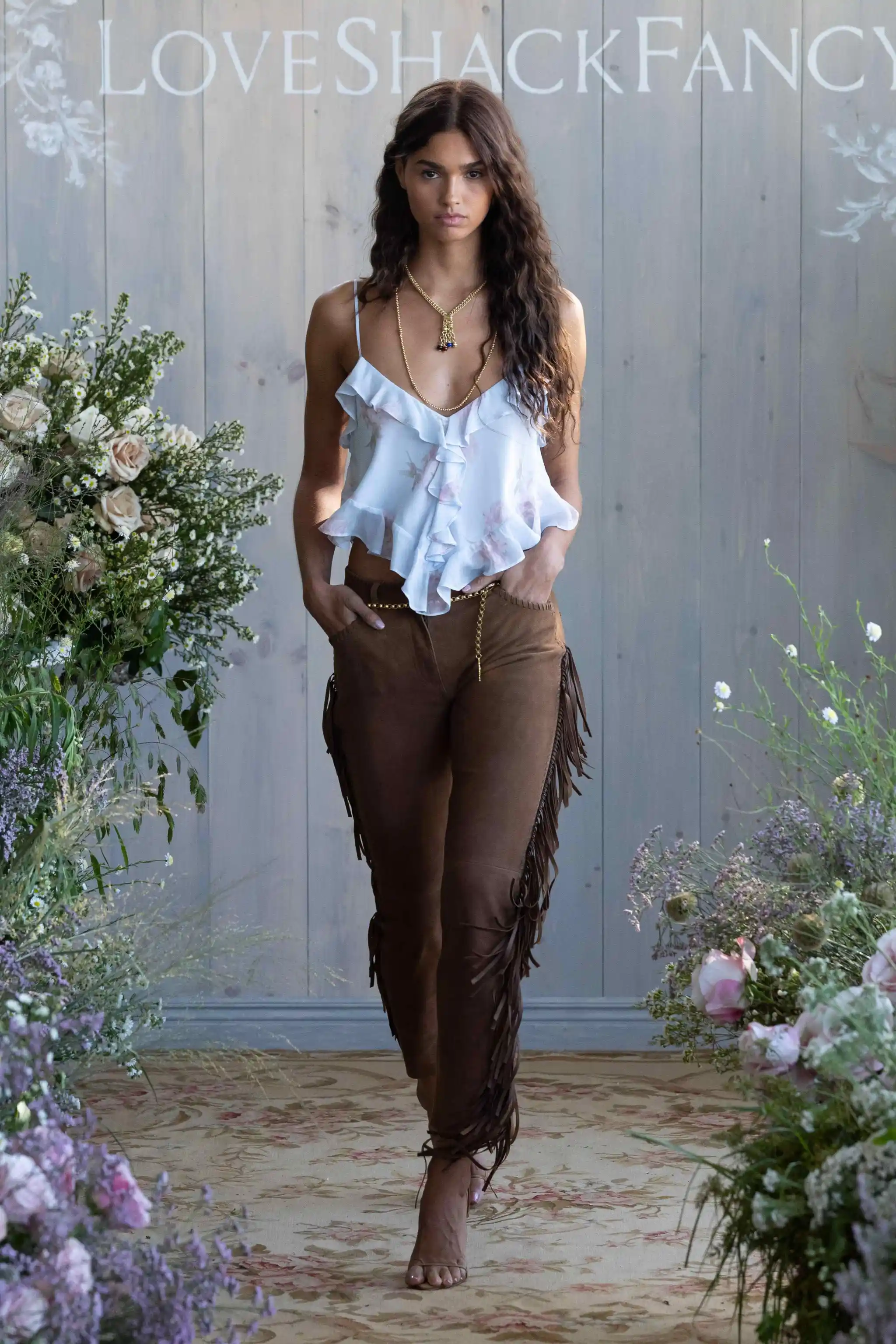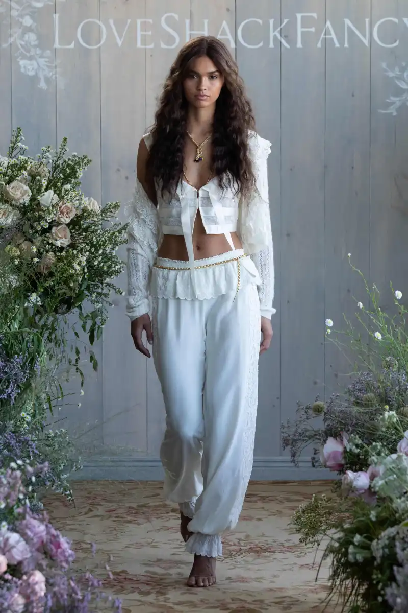 LoveShackFancy’s Spring 2026 collection, presented by Rebecca Hessel Cohen, embraced a whimsical prairie-romance aesthetic, merging hyper-femininity with modern Western style. The designs highlighted suede micromini shorts with ruffle trims, lace V-neck crop tops, calico-patterned bralettes and corsets, and a piano shawl reimagined as a semi-sheer hip-hugging maxi dress. Cohen aimed to celebrate youthful, playful femininity, noting that the collection is “an homage to the American girls,” with Kate Hudson serving as a muse.