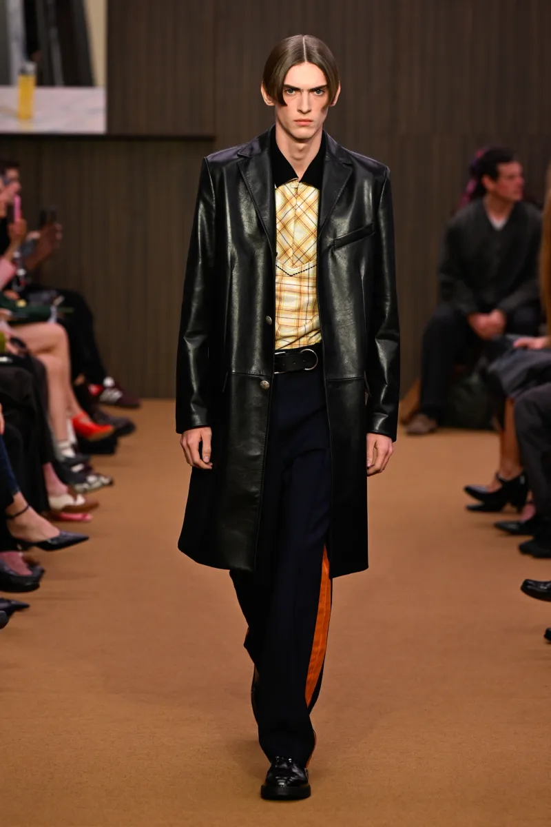Rogge’s version of Marni veered slightly punk — true to the founder’s allergy to anything too pretty or merely cute. “We toughened everything up a bit,” she said. Hardware appeared throughout, turning fastenings and studs into design gestures rather than just functional details. Shearling and goat short coats reimagined Marni’s long relationship with furry textures. Foundational prints returned — stripes pushed forward, dots reappearing as large loose discs attached to tops and skirts, jingling with movement. Graphic florals stayed sharp and modernist, with no sugar and no softness. Decoration remained artistic, maintaining what the house has always done best: that particular hallucinatory streak that makes Marni so hard to imitate and so easy to recognise.