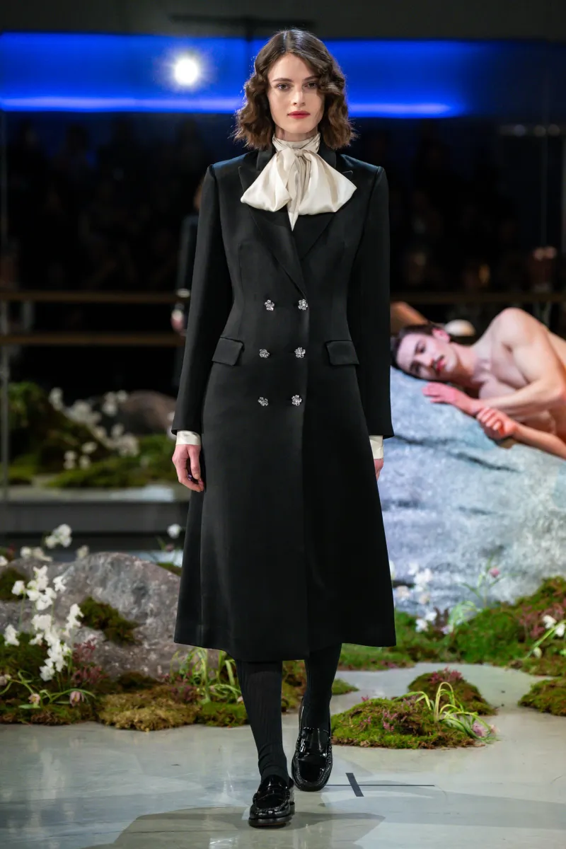 Patrick McDowell knows their client well — well enough to leave chocolate truffles on the seats, well enough to send personal notes, and well enough to know exactly when to push gently against their own established aesthetic. This season, held at the South Bank studios of the Rambert Dance Company, that push was quietly but clearly present.