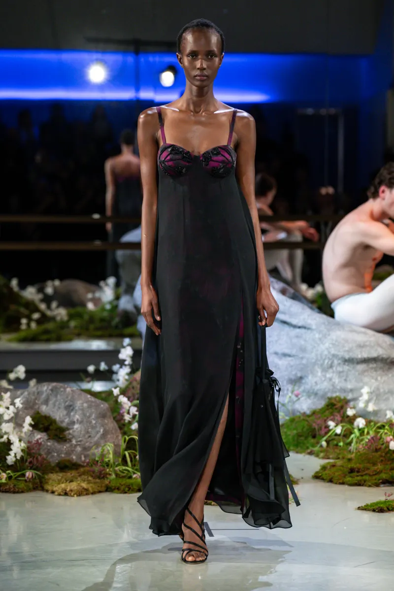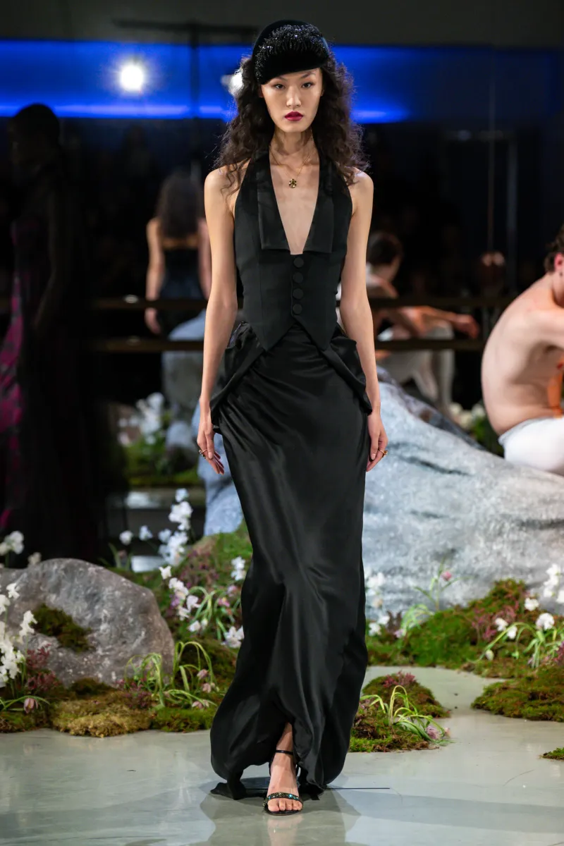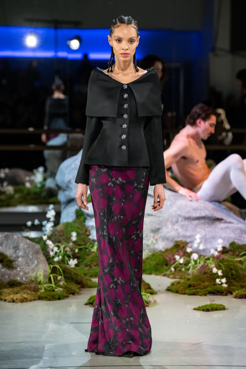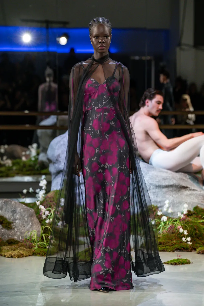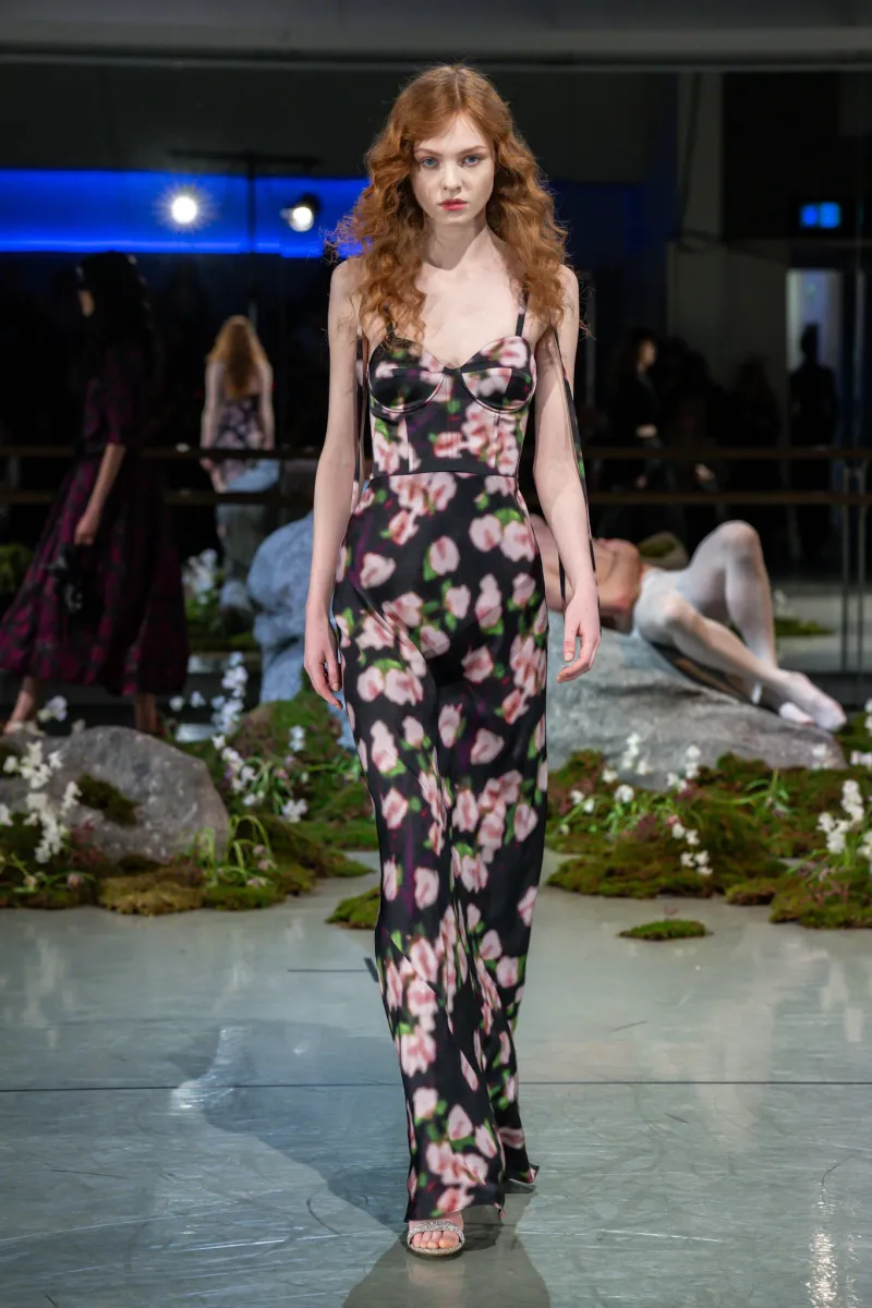 What was notable this season was a deliberate loosening of the McDowell signature. The slinky silk floor-length gowns had dropped waists. Embellishments were stripped back. The result was still unmistakably McDowell — never casual, always considered — but more wearable than previous outings, which was precisely the point. Twenty-five looks moved through the dance studio in silk crepe and silk damask, cotton and wool viscose, in black, white, pink and plum. Two floral prints, made from photographs of flowers taken by McDowell’s own team, appeared on floor-length gowns and two-pieces with tailored, voluminous skirts.
