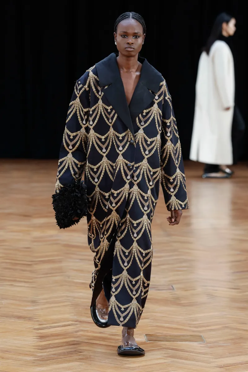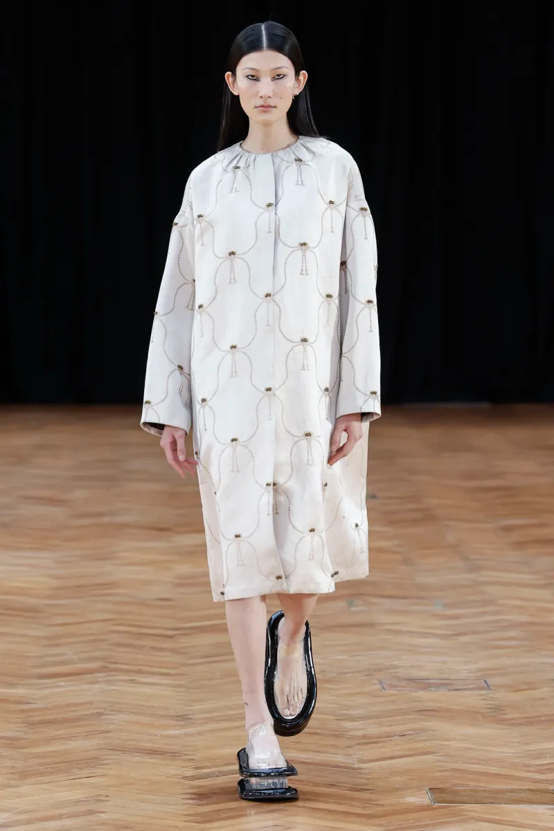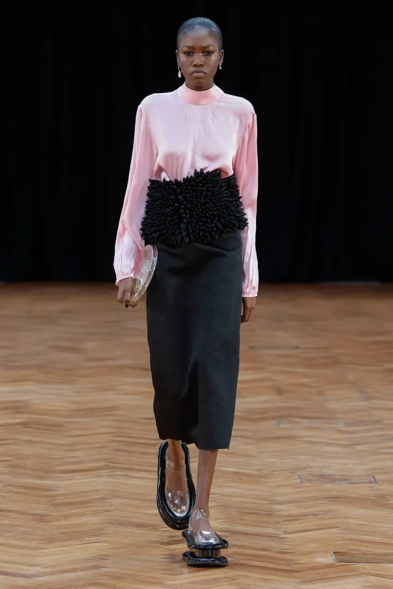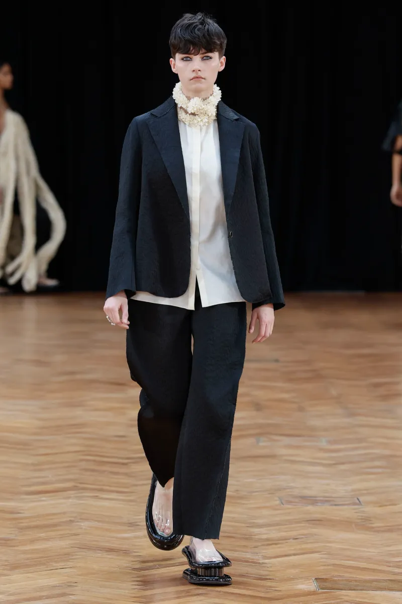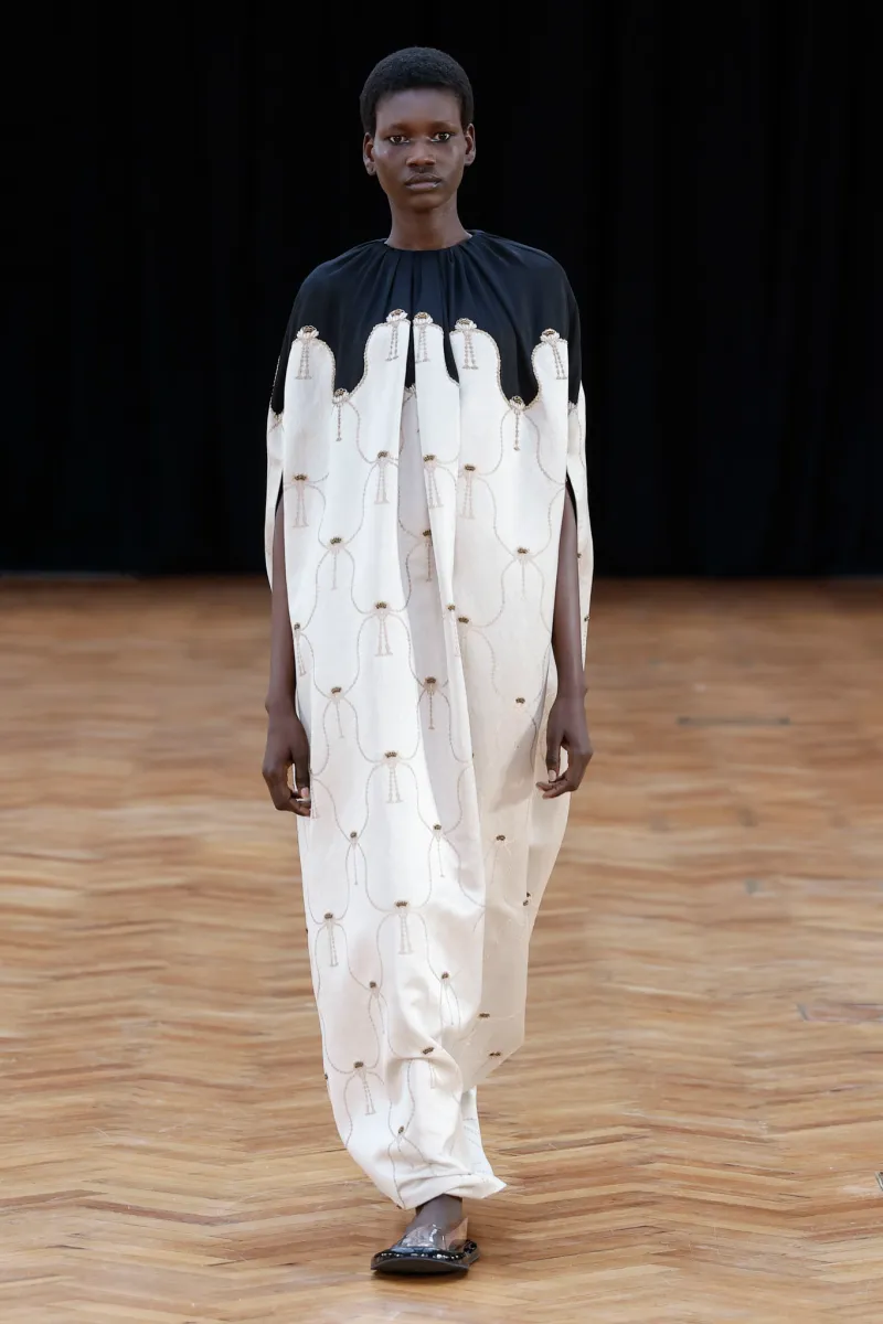 Styling reflected the same sensibility. Natural hair, minimal makeup, a presentation that felt almost meditative — everything arranged to let the textures, colours and movement of the garments occupy the centre of attention without competition.