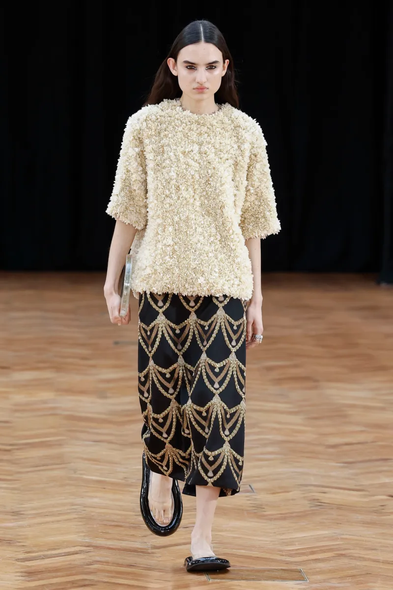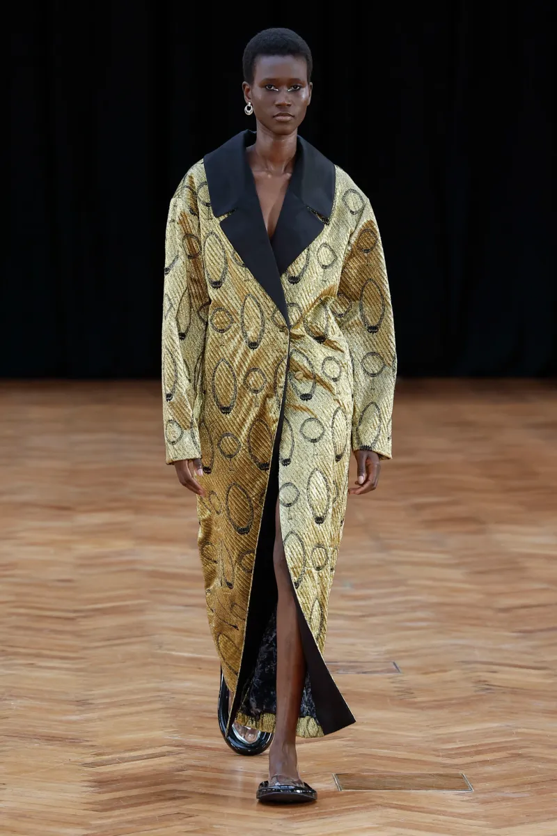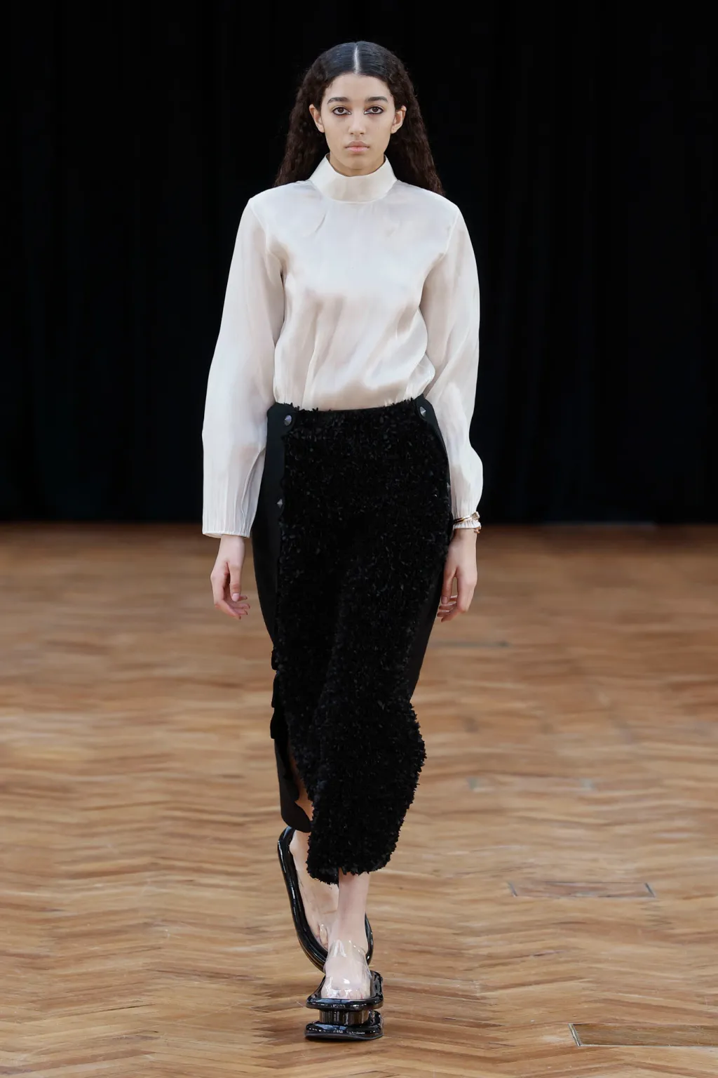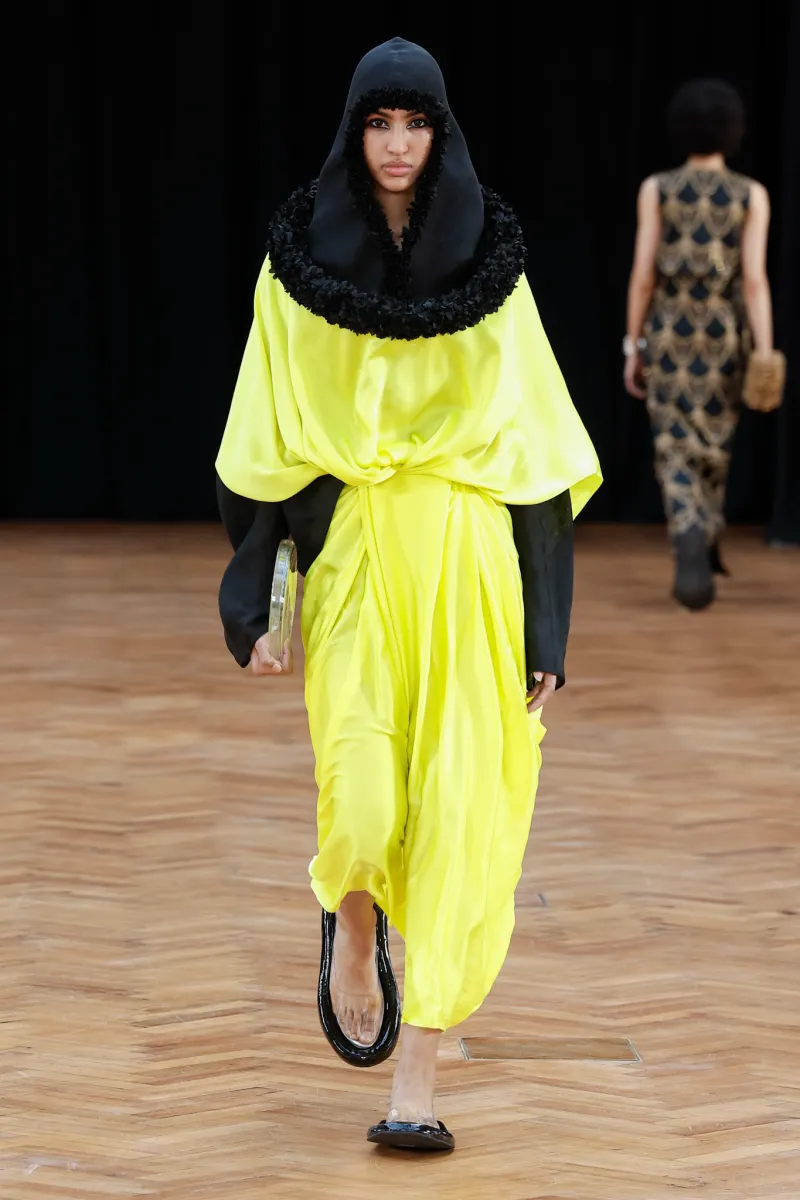 Styling reflected the same sensibility. Natural hair, minimal makeup, a presentation that felt almost meditative — everything arranged to let the textures, colours and movement of the garments occupy the centre of attention without competition.