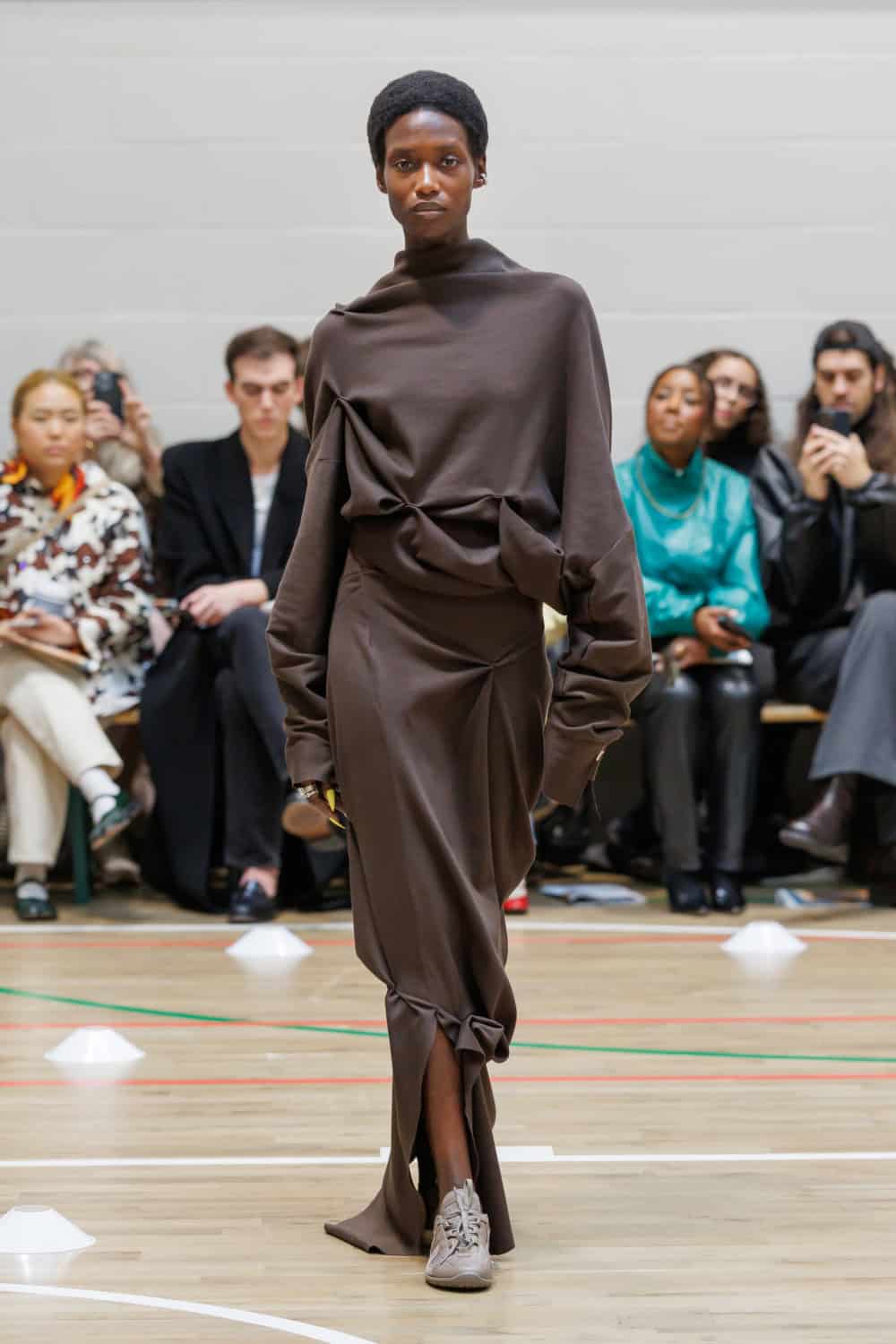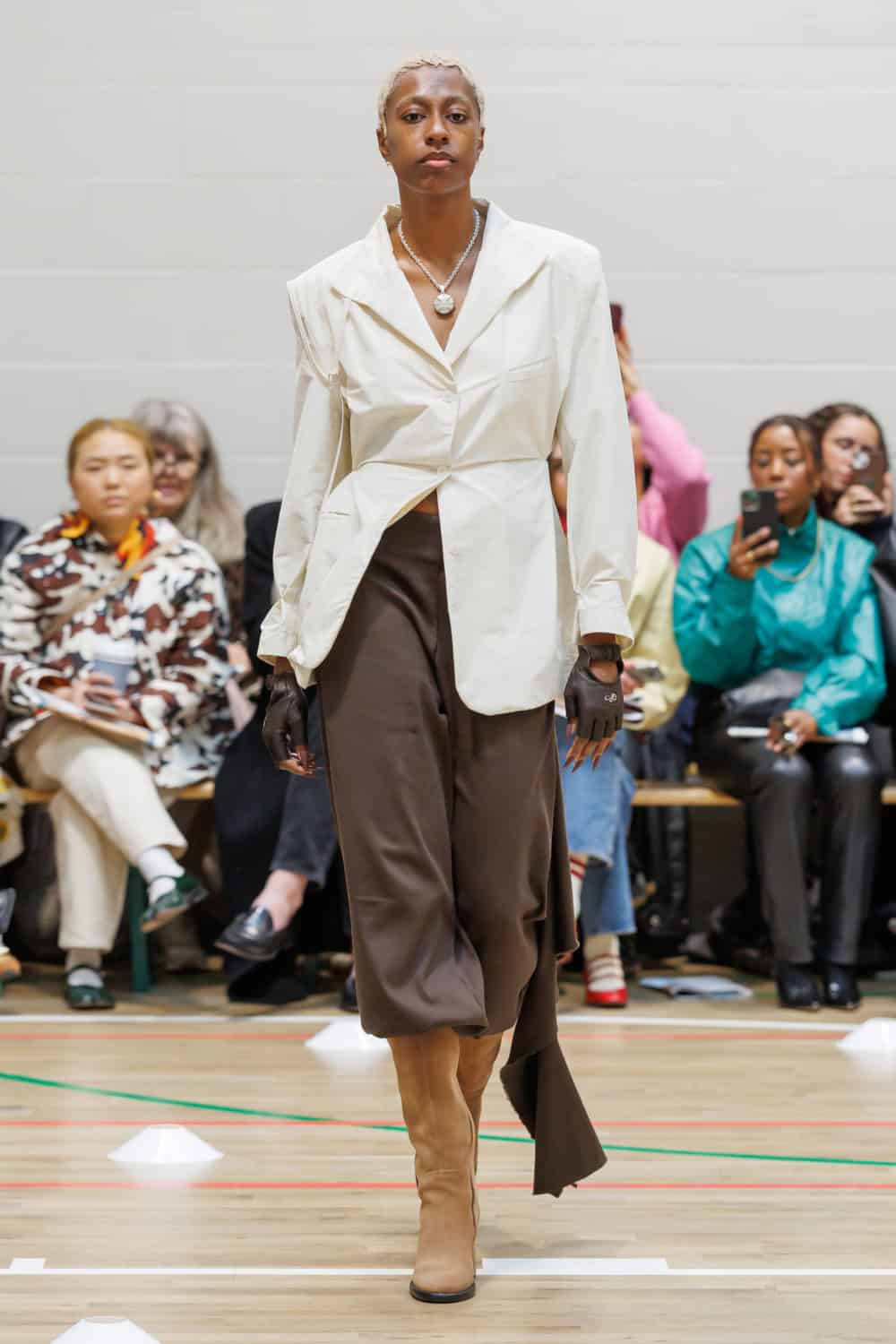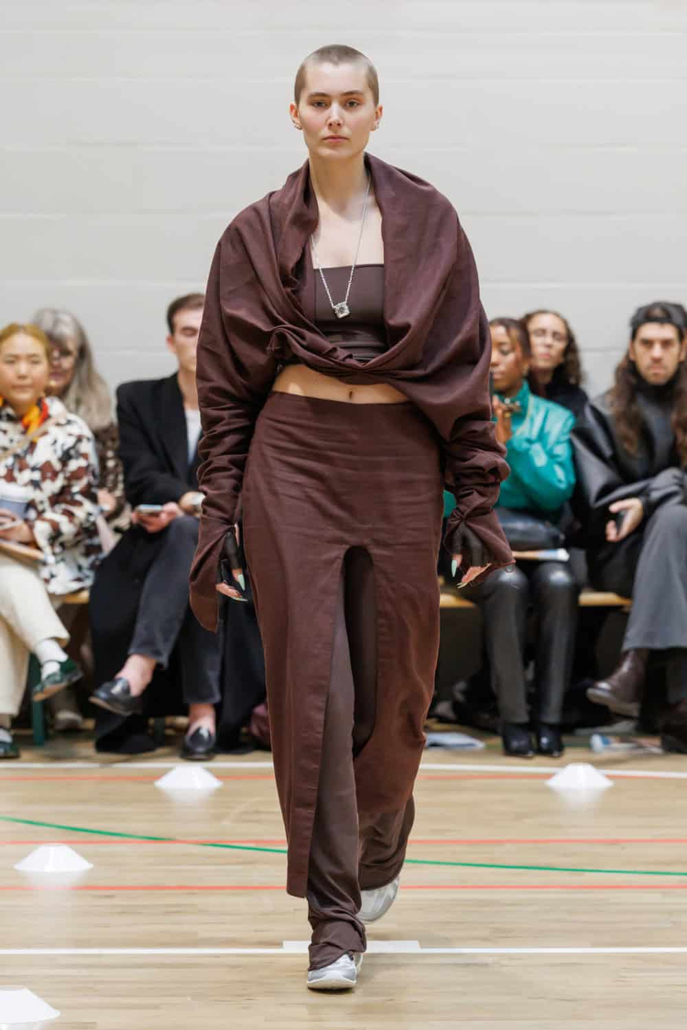 McKenzie also collaborated with Pangaia to transform all-white tracksuits for members of the Athene Club outdoors collective, paired with Ecco shoes. Standout moments included McKenzie’s mother wearing a ruched leather track jacket that evolved into a trench coat, complemented by chocolate-brown ballooned trousers.