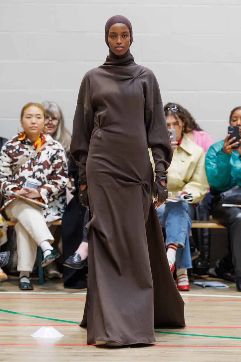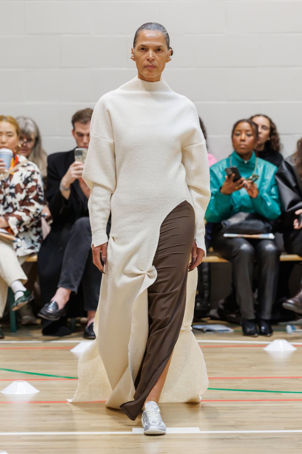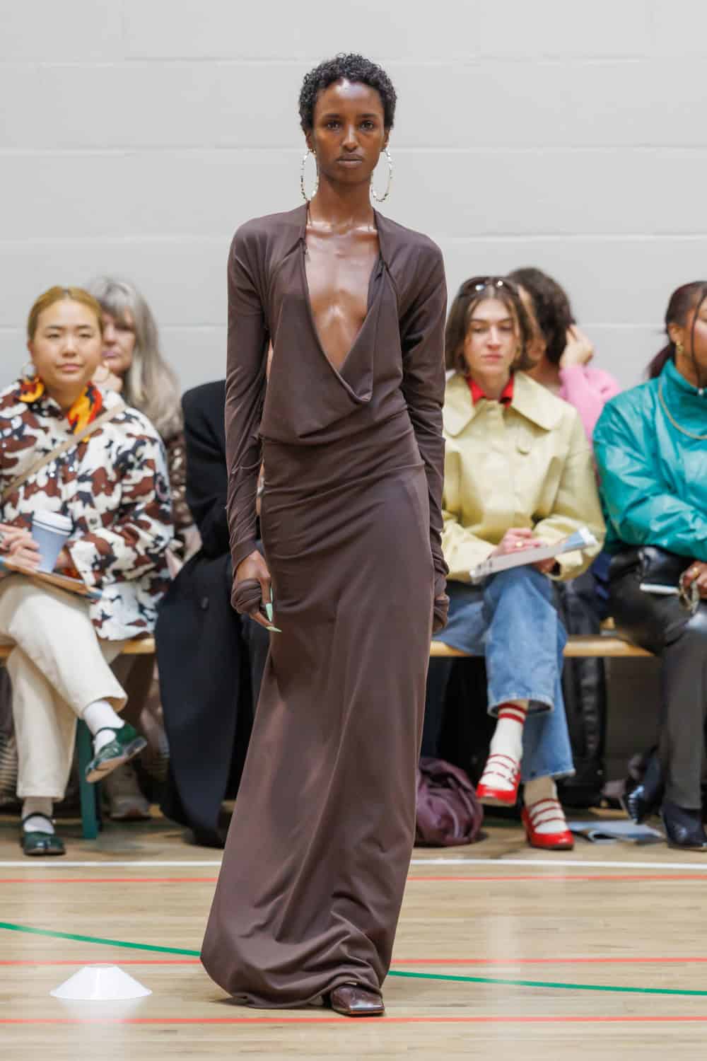 McKenzie also collaborated with Pangaia to transform all-white tracksuits for members of the Athene Club outdoors collective, paired with Ecco shoes. Standout moments included McKenzie’s mother wearing a ruched leather track jacket that evolved into a trench coat, complemented by chocolate-brown ballooned trousers.