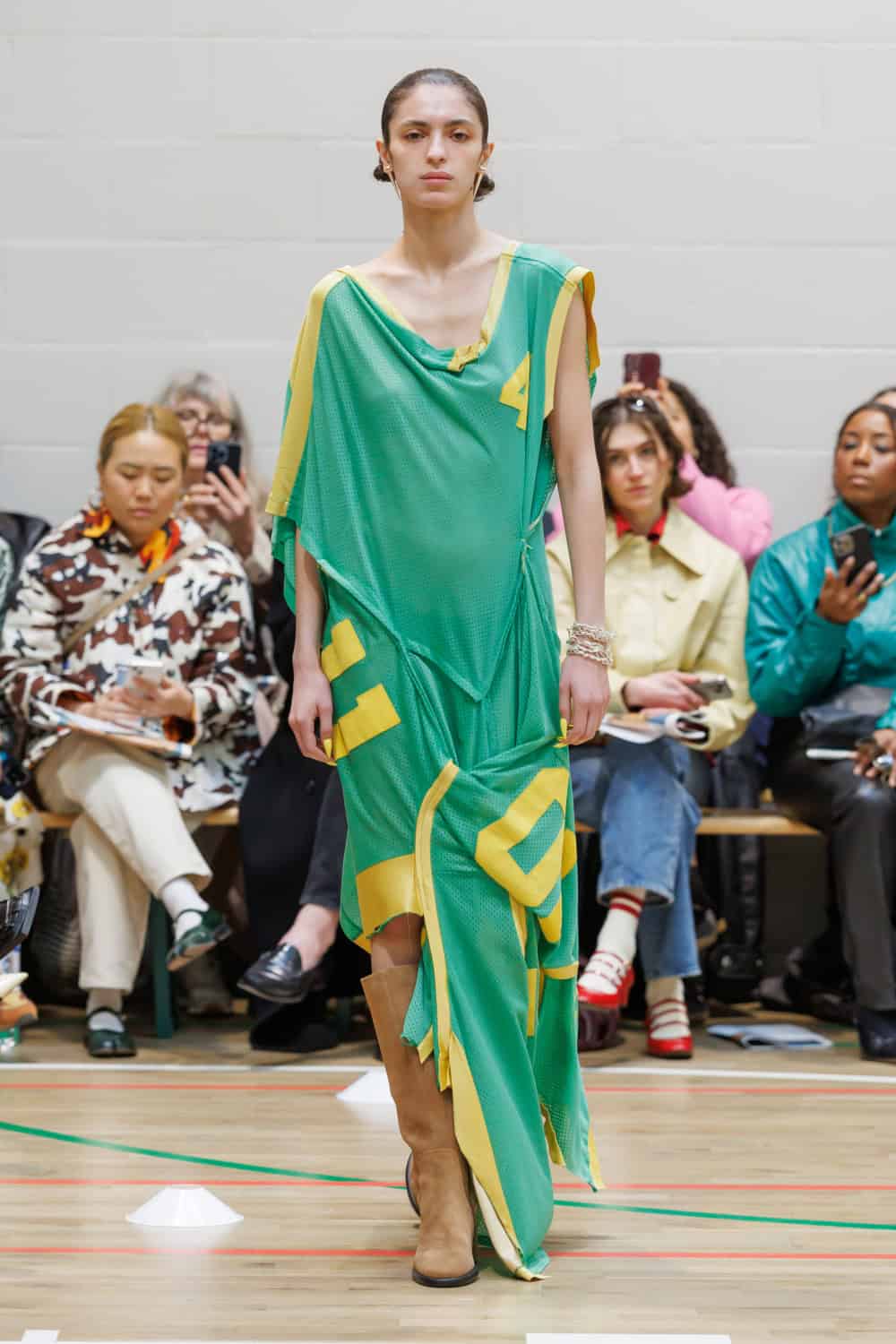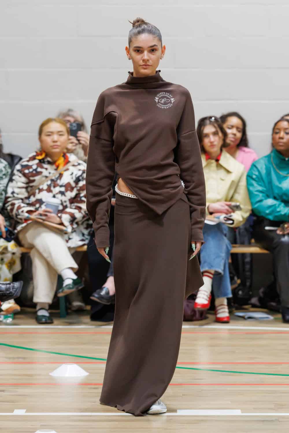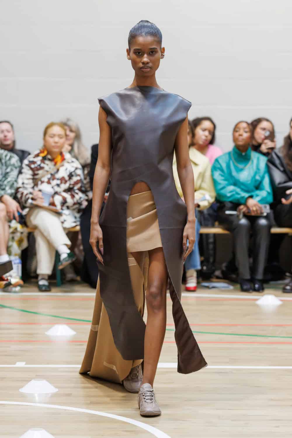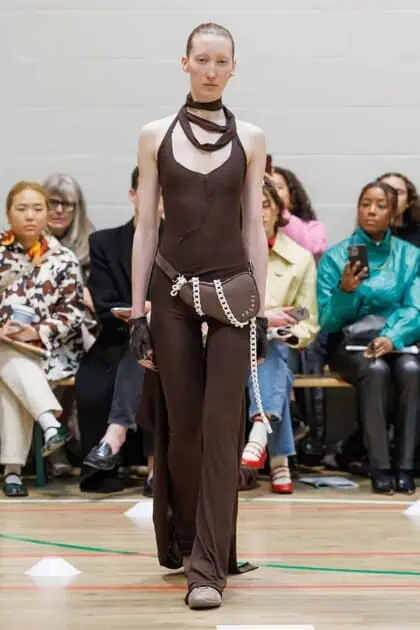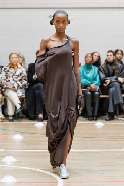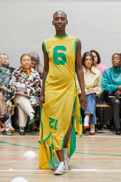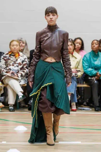 The collection drew inspiration from McKenzie’s school days at Walthamstow School for Girls, where she excelled in athletics. Old P.E. kits were upcycled into dresses and skirts that jutted at the hips, merging nostalgia with modern tailoring. Lauren Beharie of the English National Ballet opened the show en pointe, underscoring the collection’s graceful, movement-focused energy.