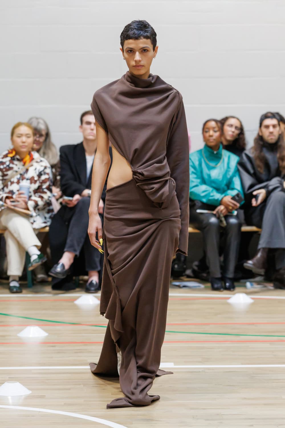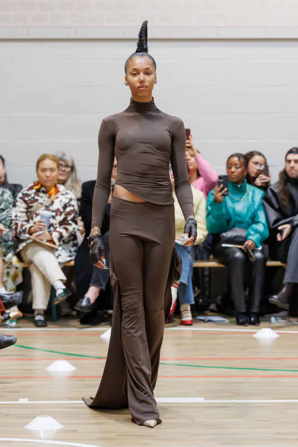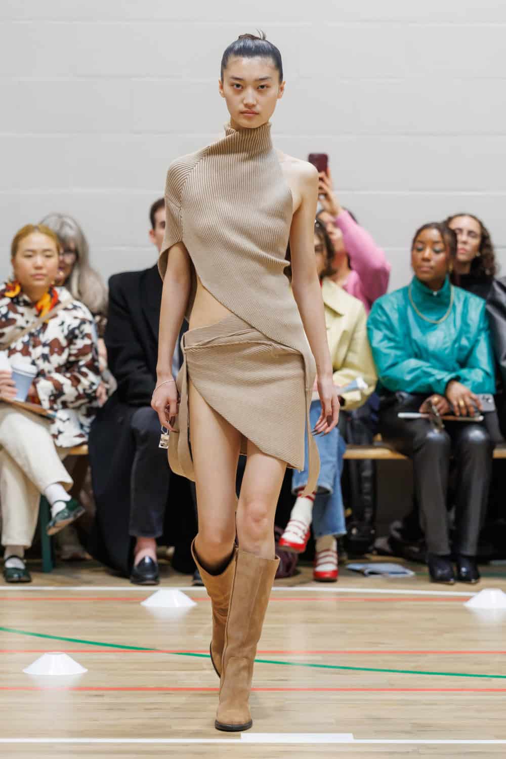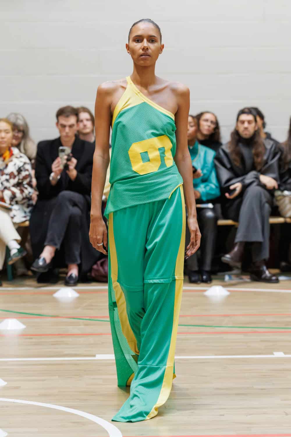 The collection drew inspiration from McKenzie’s school days at Walthamstow School for Girls, where she excelled in athletics. Old P.E. kits were upcycled into dresses and skirts that jutted at the hips, merging nostalgia with modern tailoring. Lauren Beharie of the English National Ballet opened the show en pointe, underscoring the collection’s graceful, movement-focused energy.