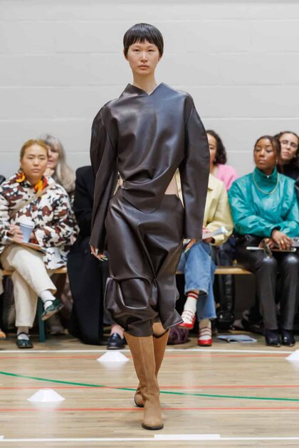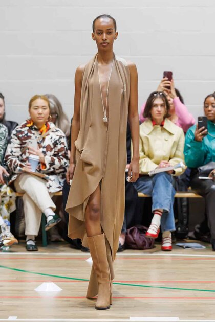Selasi, helmed by Ronan McKenzie, made her official London Fashion Week debut with a collection rooted in intimacy and personal memory. Jersey and buttery leathers draped and folded around the body, often pinned, tucked, and gathered into sculptural shapes that highlighted McKenzie’s instinctive approach to design.