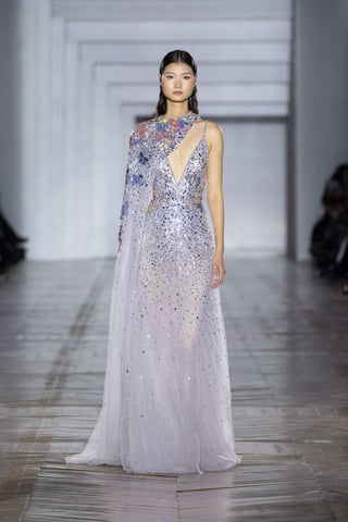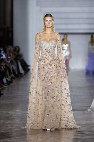 The expertise of Tony Ward in embroidery was evident from the start. The dresses were adorned with micro-beaded floral patterns and crystal waterfall designs that sparkled under the bright lights. The sheer layers were draped over the structured base, which added depth without weight. The designs varied from the fitted mermaid silhouette to the full ball skirt, all of which were proportionate.